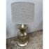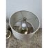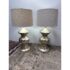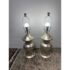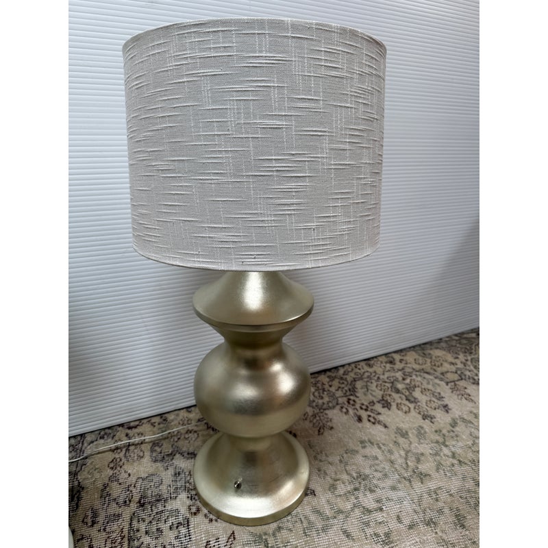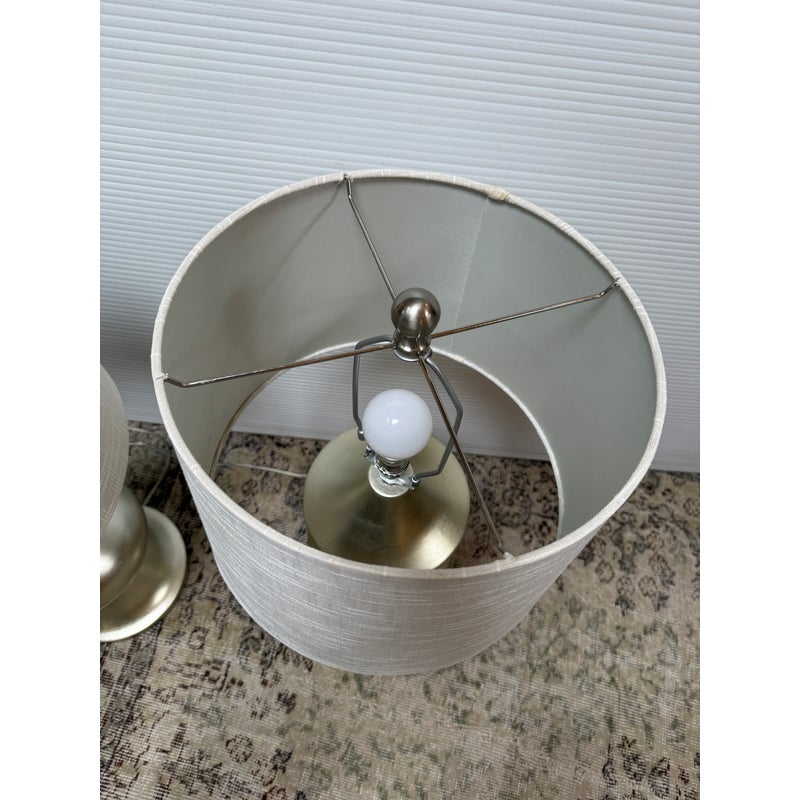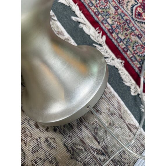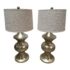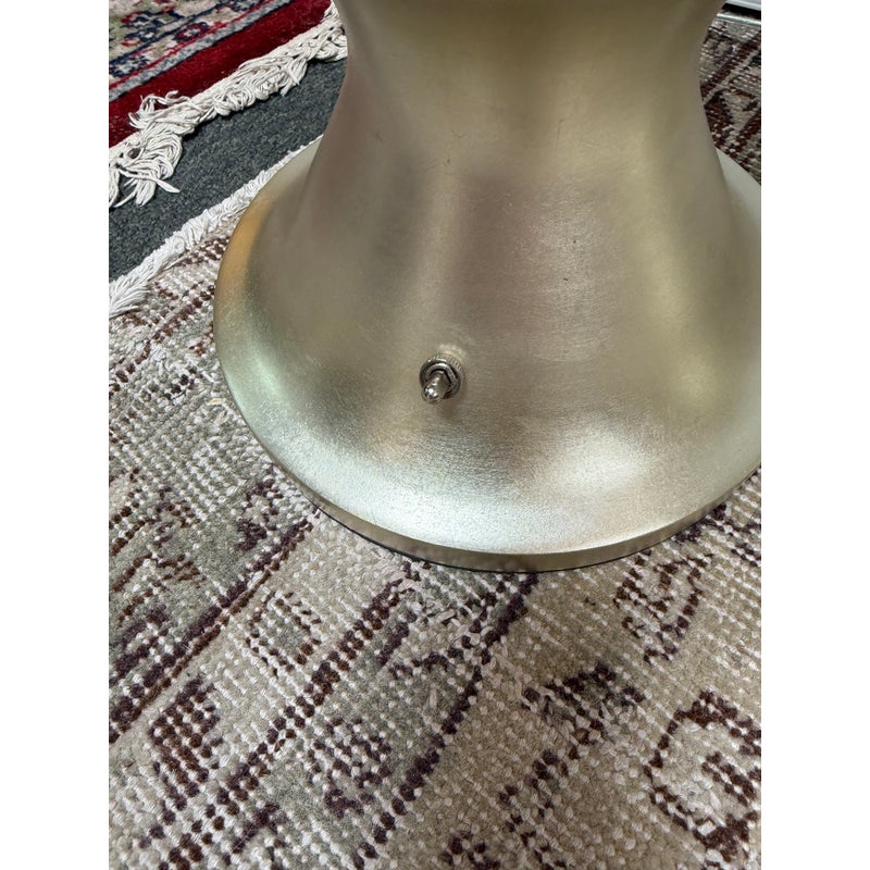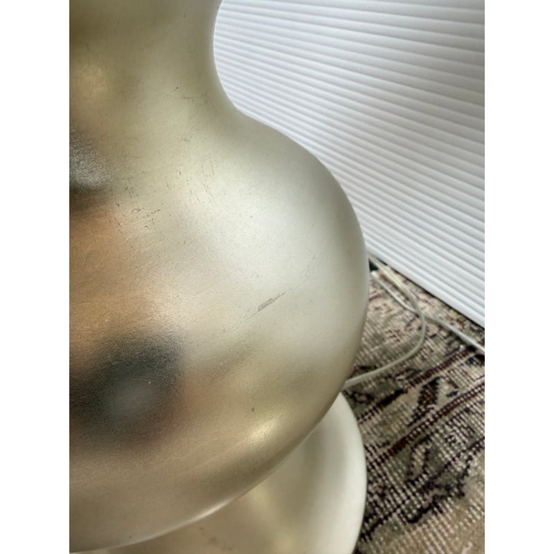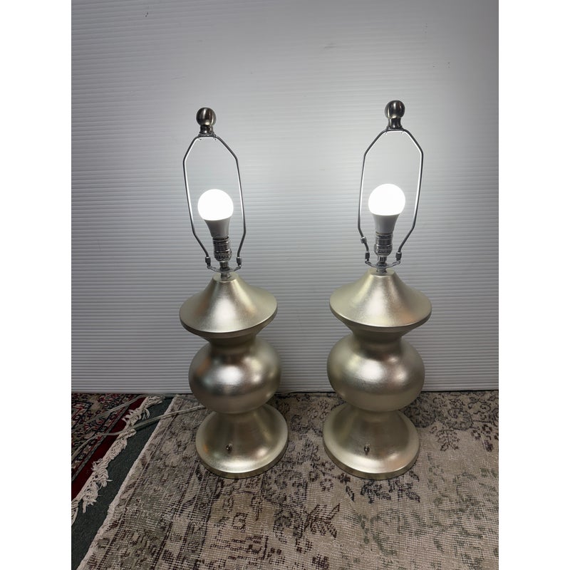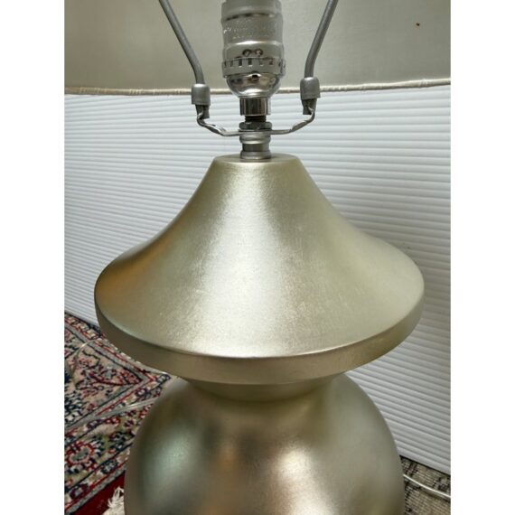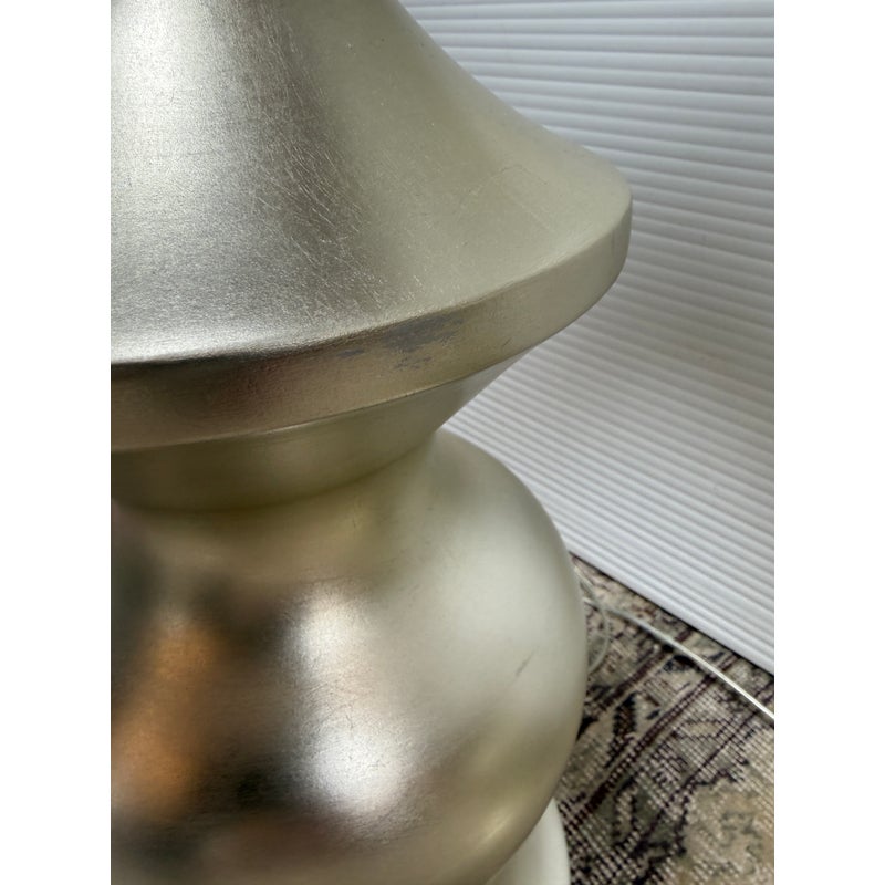 Design Plus Gallery presents a Pair of Sculpted Table Lamps with Contemporary Style. The lamps have a heavy base with high design and a platinum, metallic stain. The base has a baluster shape with a pointed top, disc base, and central orb. They glow with their metallic paint, adding dimension to your room whether they are on or off. The switch is found on their base. Each has textured and patterned lamp shades with round top finials. They are in good overall condition for their usage.