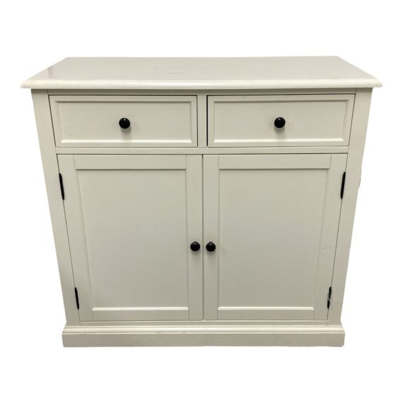 Design Plus Gallery presents a Contemporary Shabby Chic Distressed White Cabinet. Features include two drawers with dovetail joinery and a double-door cabinet with an adjustable shelf. The cabinet is constructed with wood and has a distressed white finish. The drawers and cabinets have black knob pulls. Visible scratches on top + minor wear consistent with usage; cabinet is in good condition.