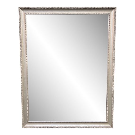 Design Plus Gallery presents the Contemporary Silver Framed Beveled Mirror. A rectangular mirror with beveled edges is held in a wood frame with a silver finish. The frame has two running accents: a dot trail on the inner edges, and a floral motif along the outer edges. The hanging cord allows the mirror to be vertically hoisted. Minor wear from use; mirror is in good condition.