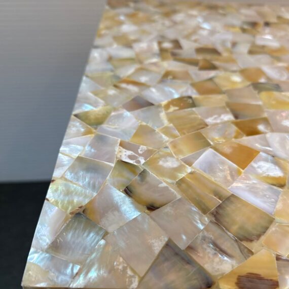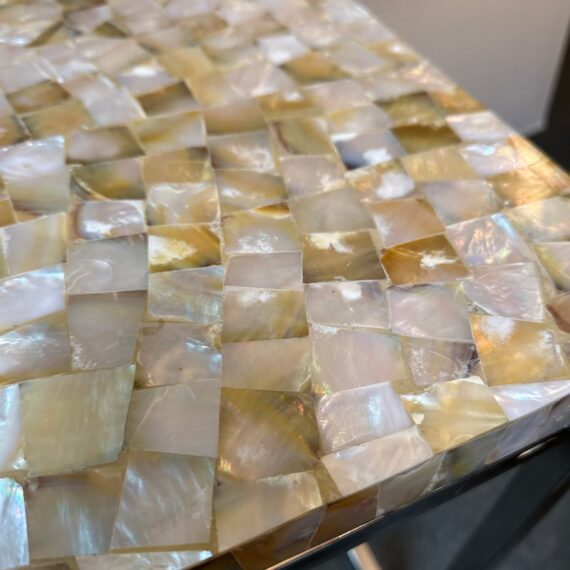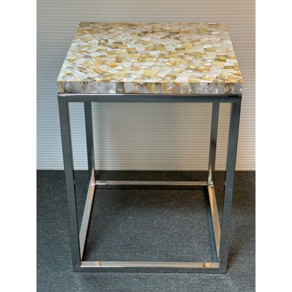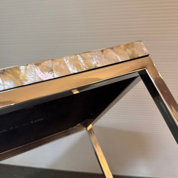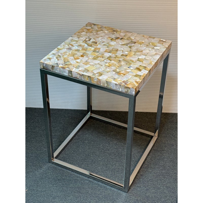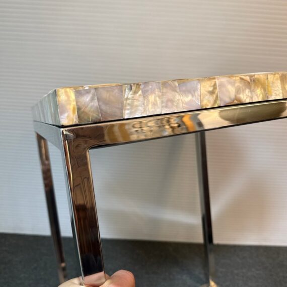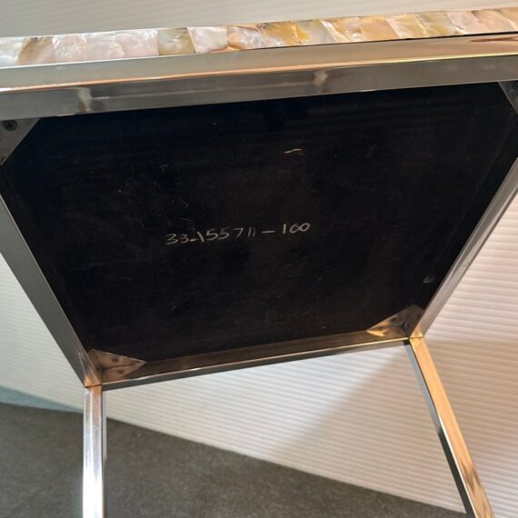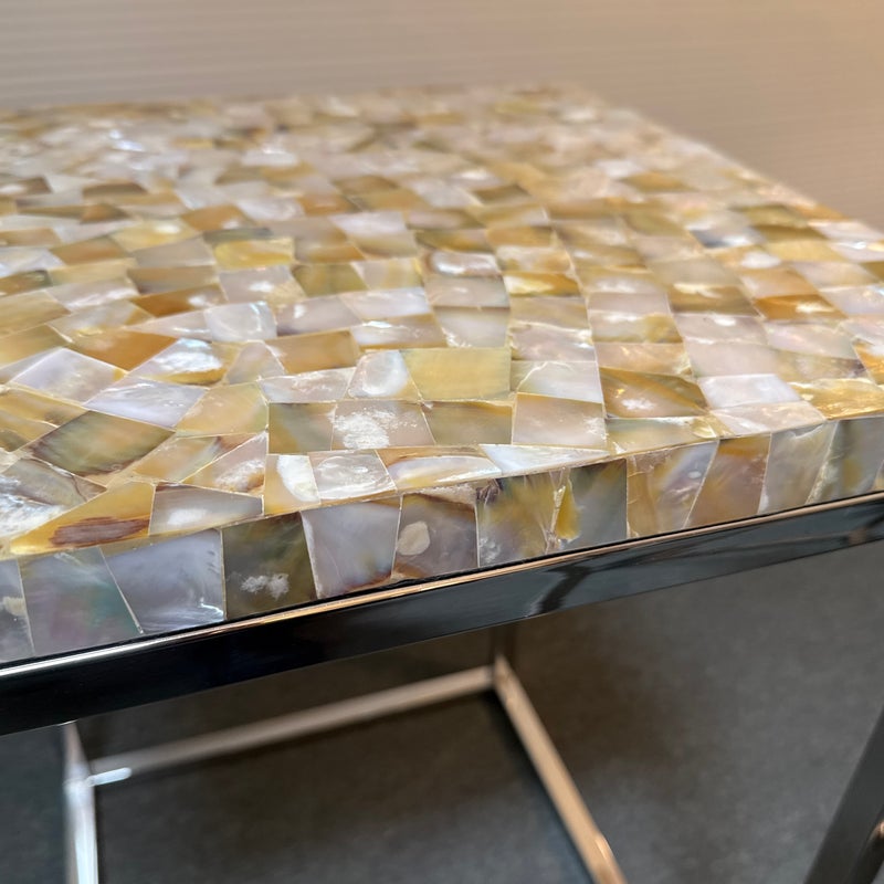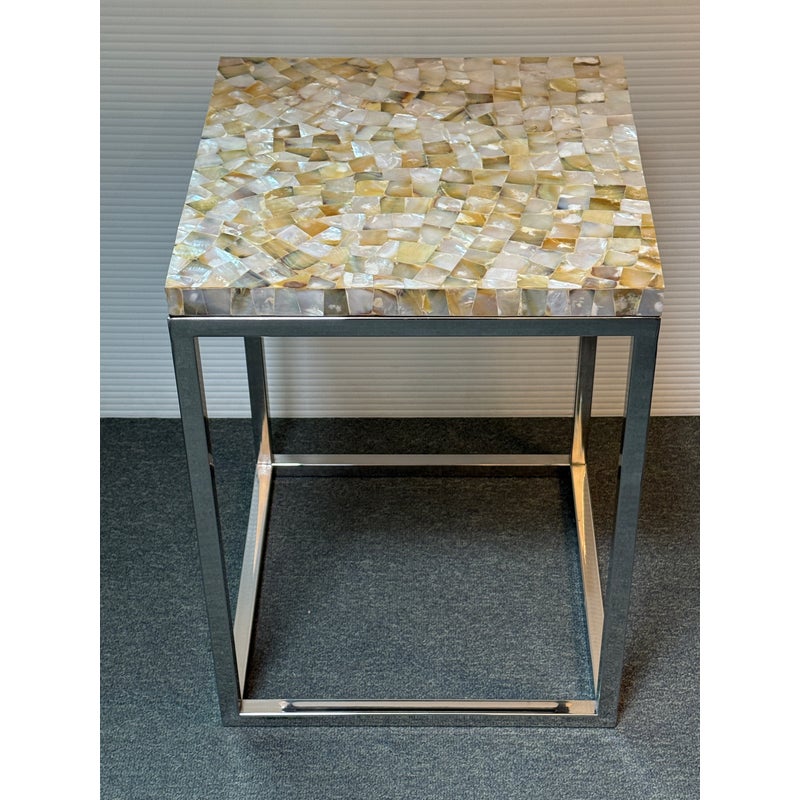 Design Plus Gallery presents a Contemporary Side Table. A simple silhouette in brushed stainless steel is topped with a sparkling mother of pearl slab for drama. Lightweight and so very functional, moves right where you need it. Light surface wear; condition is good.