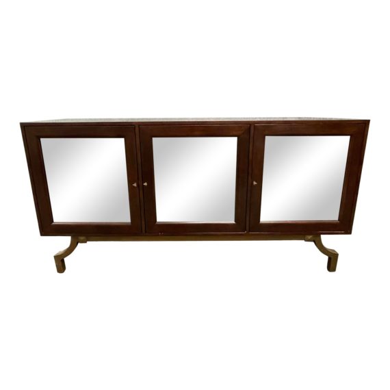 Contemporary Walnut Wood + Antiqued Mirror Three Mirrored Door Buffet
