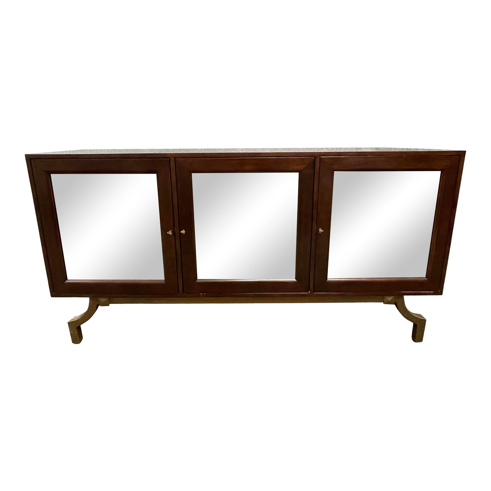 Design Plus Gallery presents a Contemporary Walnut Wood + Antiqued Mirror Buffet. Lifted bronze base supports the elegant sideboard with mirrored doors. Comes with four keys for locking. Glass is antiqued with a mercury finish. Interior of cabinets have adjustable shelving. Minor wear through out, sideboard is in good condition.