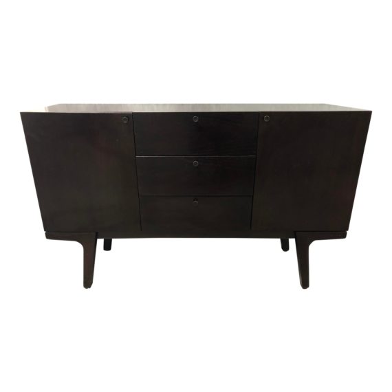 Design Plus Gallery presents a West Elm Modern Buffet. A polished espresso finish adorns the entire piece. Tiny flared legs add mid-century style. Three drawers equipped with round metal pulls and sliding tracks are stacked in the center. Swing open cabinets on either side are also updated with modern hardware.