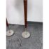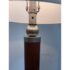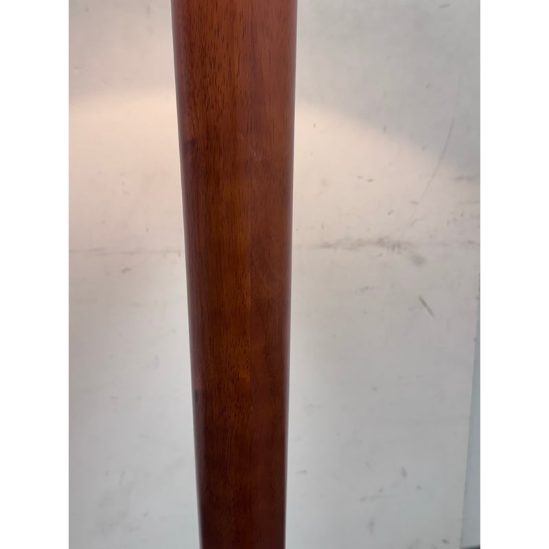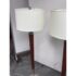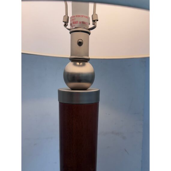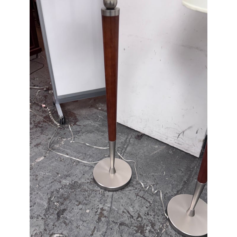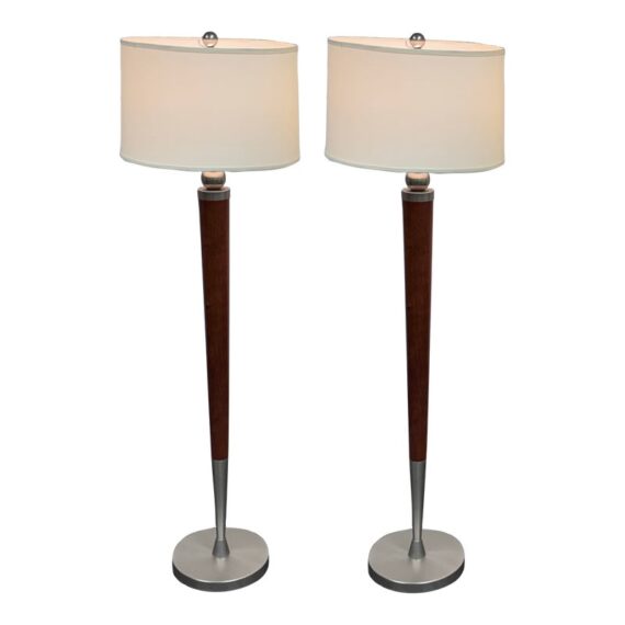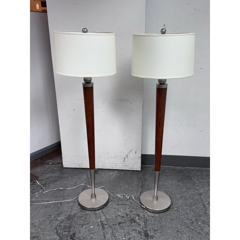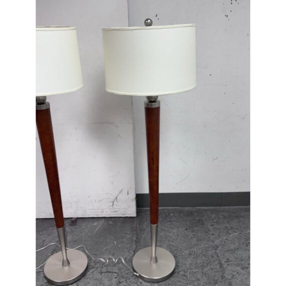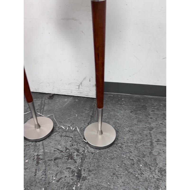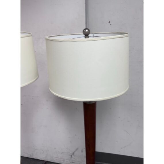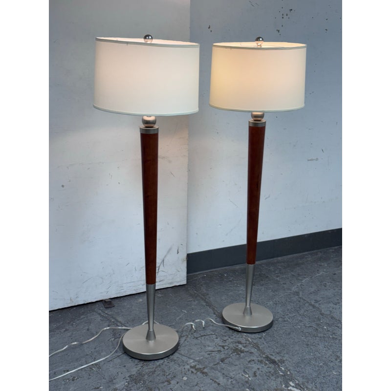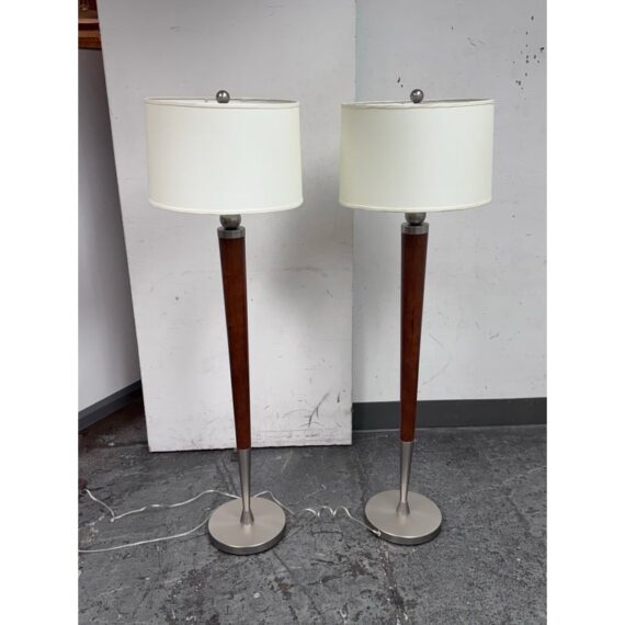 Design Plus Gallery presents a Pair of Contemporary Floor Lamps. The lamps have a solid nickel finish steel base that holds a brown tapered wood stem. There is a white linen drum shade and metal finial at the crown of each and they hold a single lightbulb. These lamps are in good overall condition with wear that is consistent with usage.