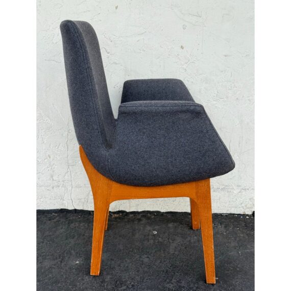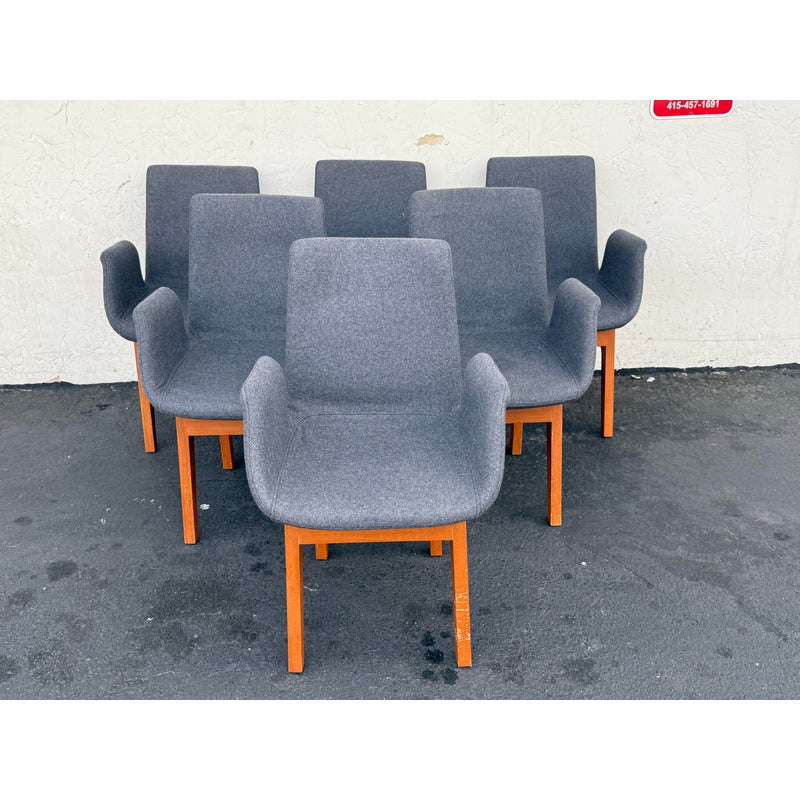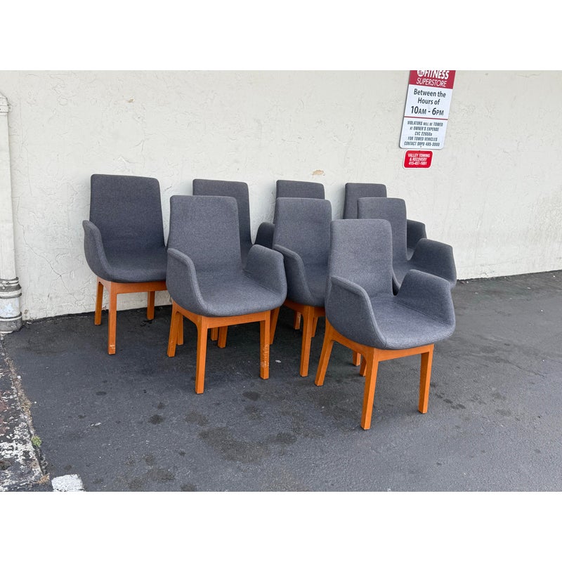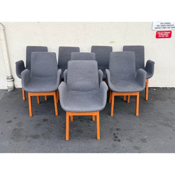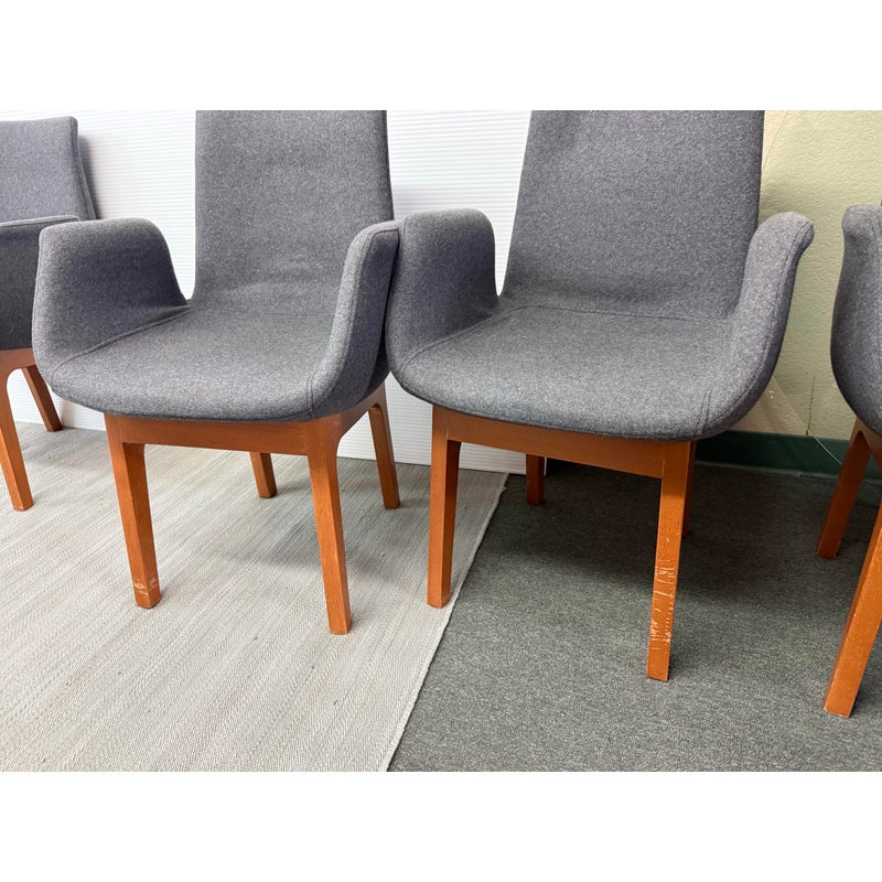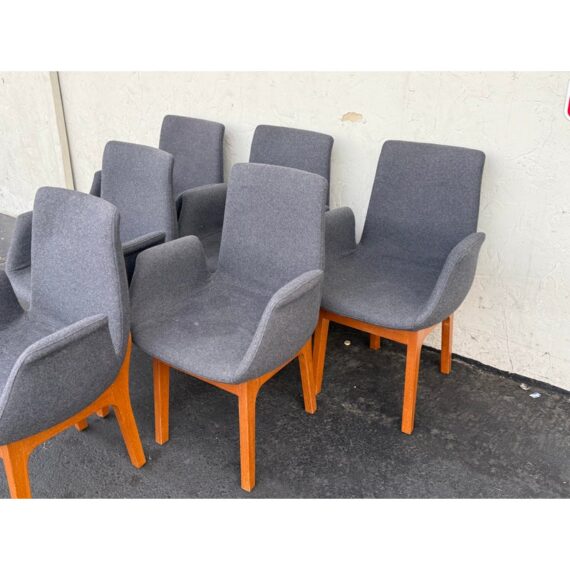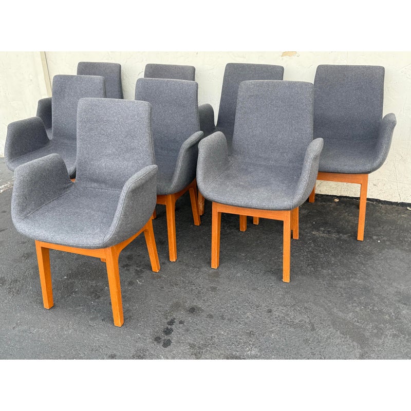 Design Plus Gallery presents a Set of Eight Dining Arm Chairs with Contemporary Style. They offer a soft all over upholstery of a medium charcoal wool felt with a cherry wood frame. They are heavy, allowing them to be used without discretion and their substance will impress your guests. They have visible wear to their seats that will require significant cleaning or reupholstery, with a few requiring touch ups to the wood frame as well.