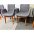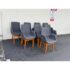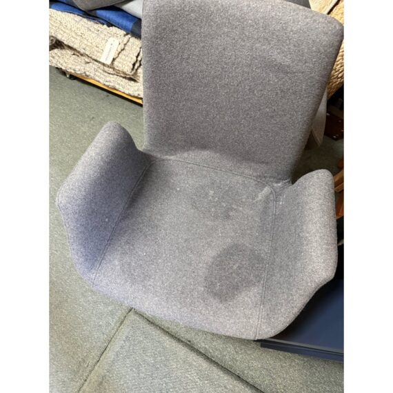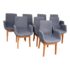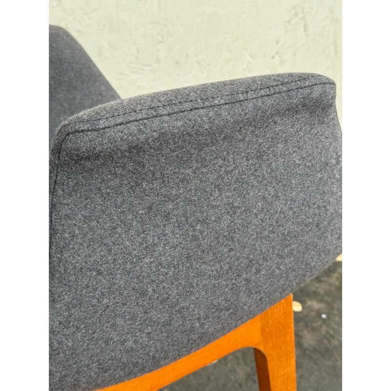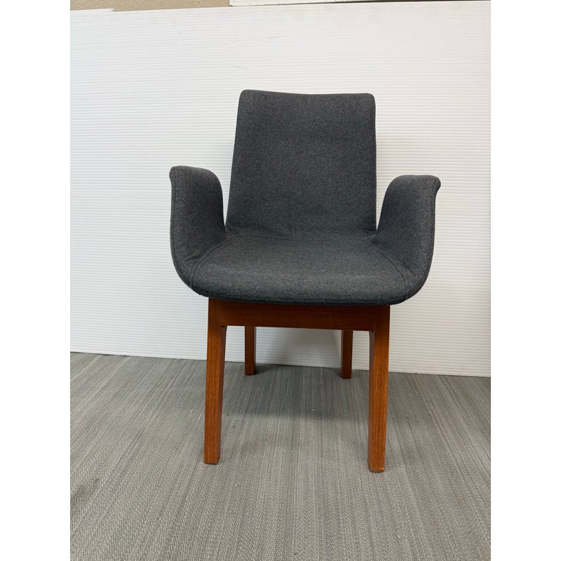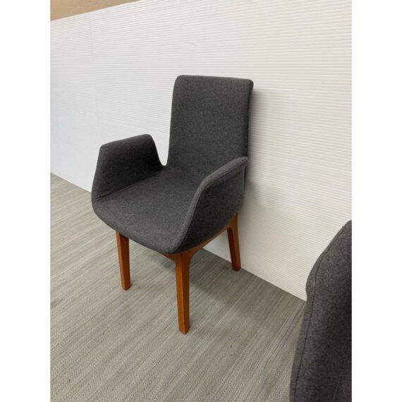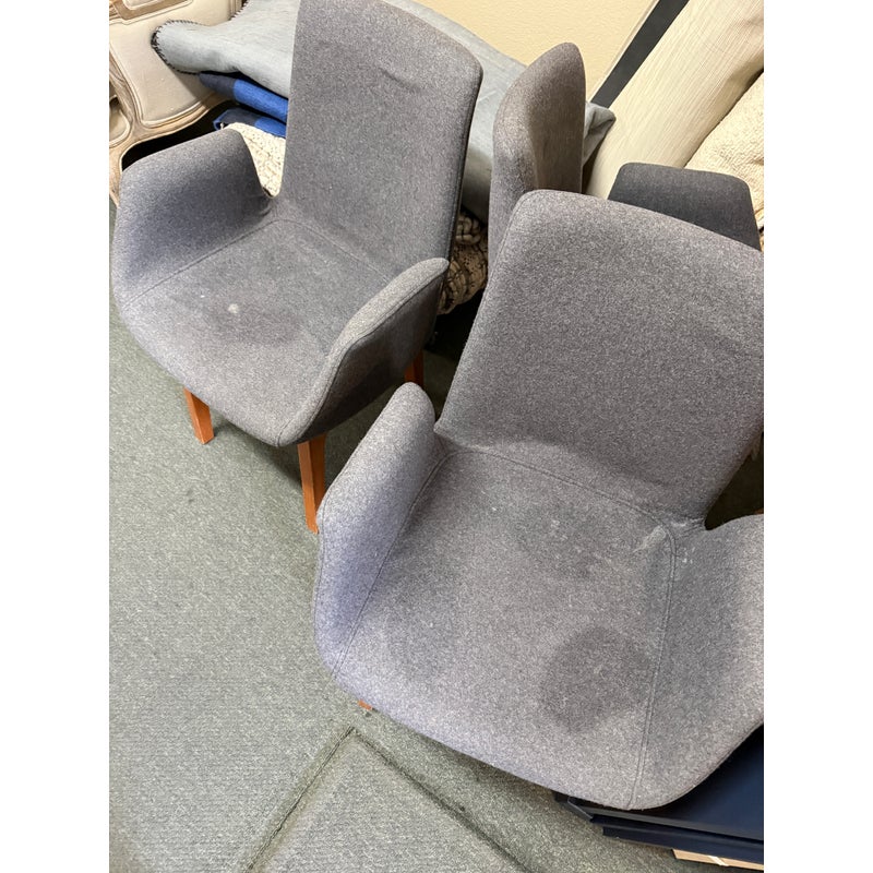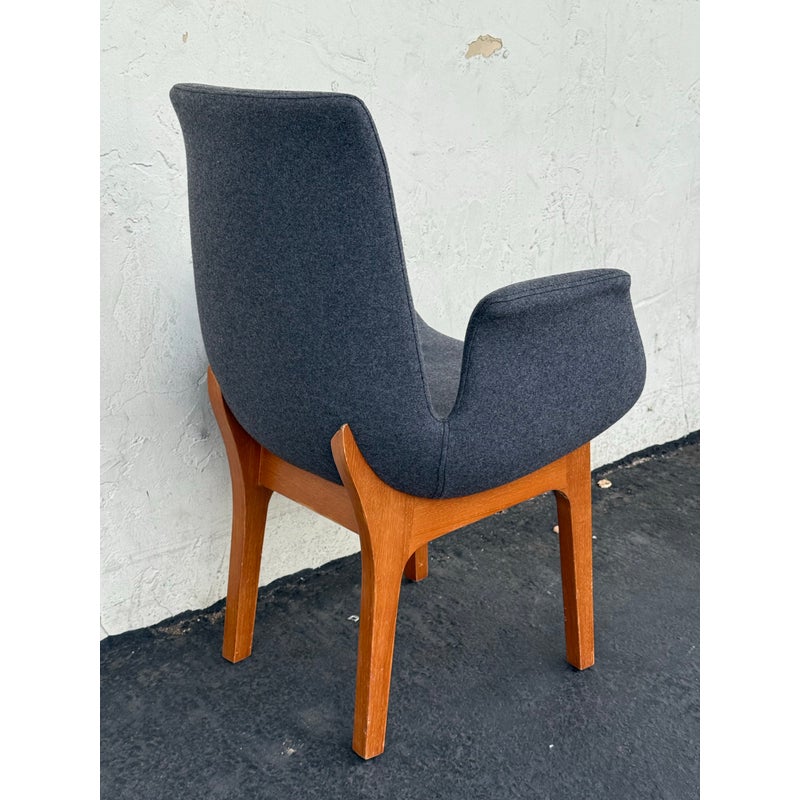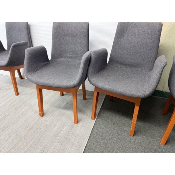Design Plus Gallery presents a Set of Eight Dining Arm Chairs with Contemporary Style. They offer a soft all over upholstery of a medium charcoal wool felt with a cherry wood frame. They are heavy, allowing them to be used without discretion and their substance will impress your guests. They have visible wear to their seats that will require significant cleaning or reupholstery, with a few requiring touch ups to the wood frame as well.