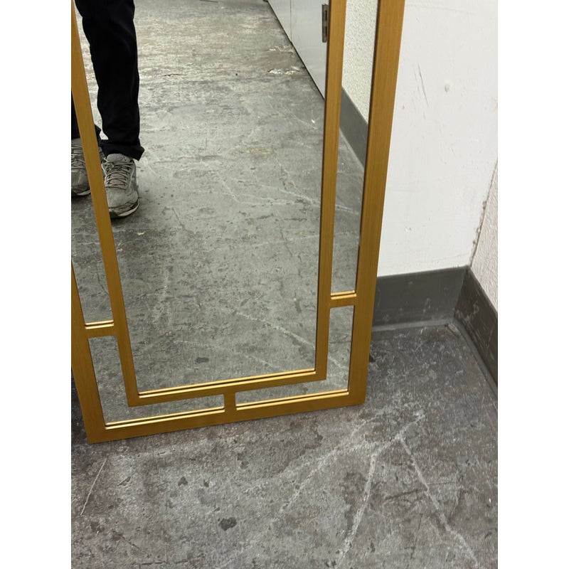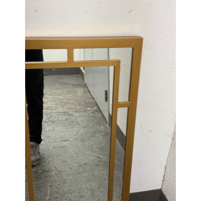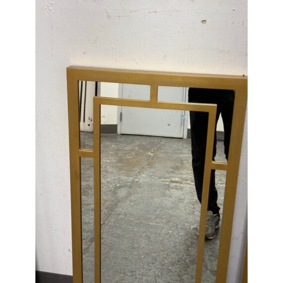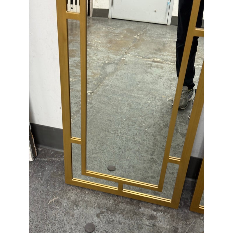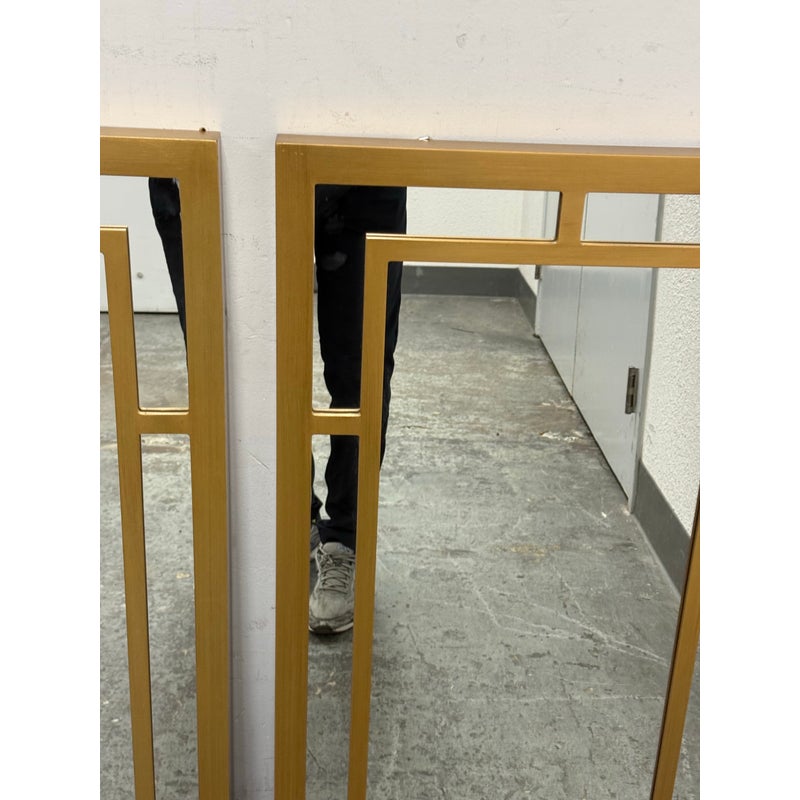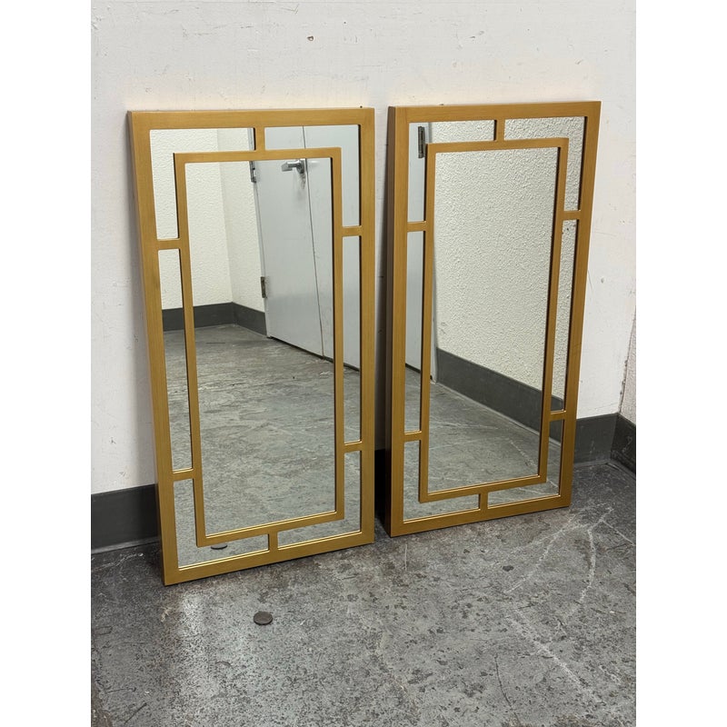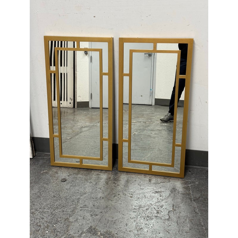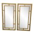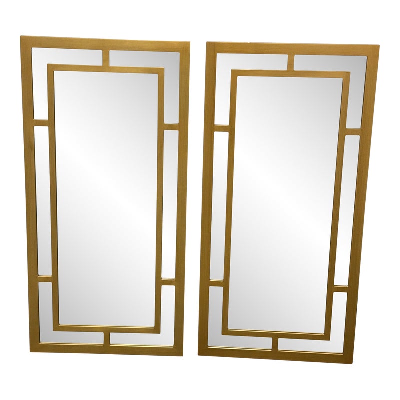 Design Plus Gallery presents a Pair of Benedict Mirrors from Cooper Classics. The rectangular mirror frame is composed of layered linear elements that form an architectural arrangement around the central mirror plate, creating depth and dimension through its balanced proportions. The geometric shapes create a visually appealing pattern finished in gold. It is in good condition, visible and minimal wear from usage. Made in Vietnam.