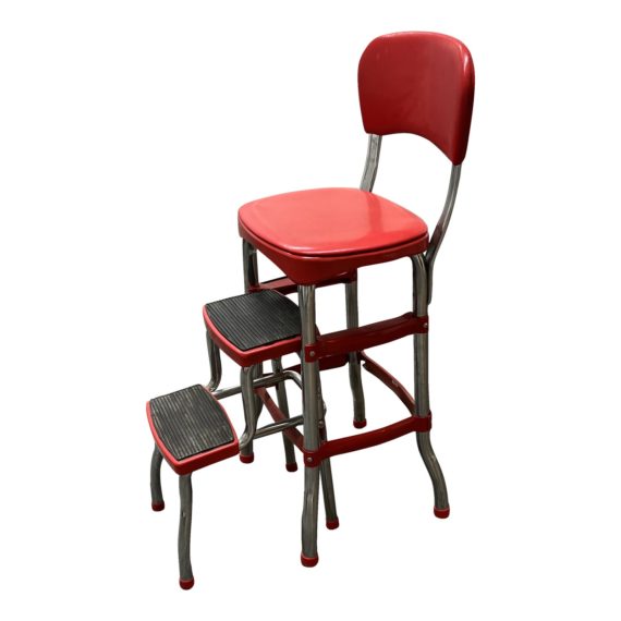 Design Plus Gallery presents a Cosco Red 2-Step Steel Retro Step Stool. Convenient design folds easily to slide in and out with ease. A pair of steps swing out from the base for easier access in workshops, kitchens, offices or closets. Metal is powder coated a vibrant cherry red. Steps have plastic inserts for adding stability. Seat and back are upholstered with an easy to clean vinyl. There is visible wear through out, ladder is in good condition.