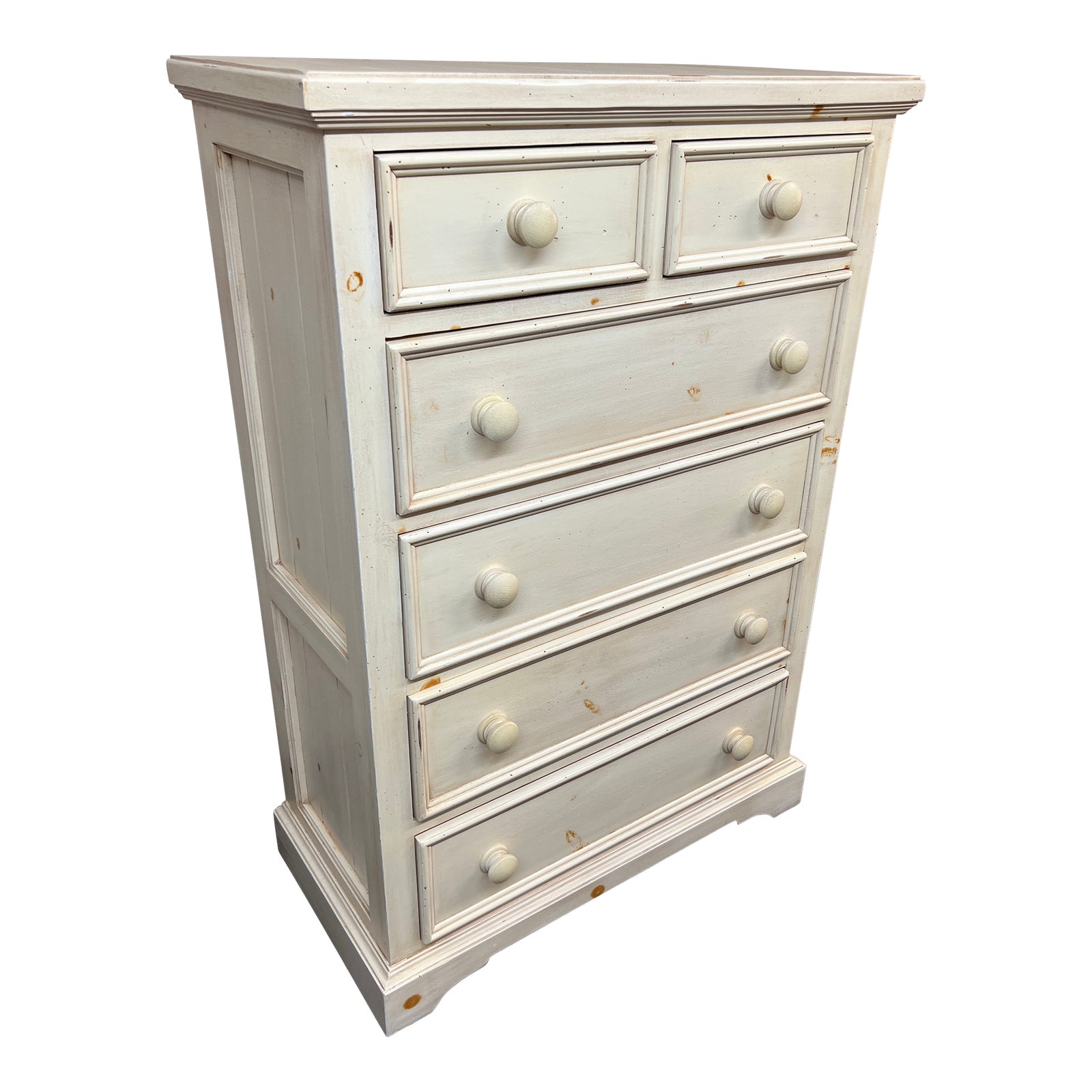 Design Plus Gallery presents a Cottage Style Dresser. Features six pullout drawers, two small over four large drawers. Crafted from solid pine woods. The finish is a light Buttercup. The drawer knobs are turned wood. Visible and minor wear from usage + age.