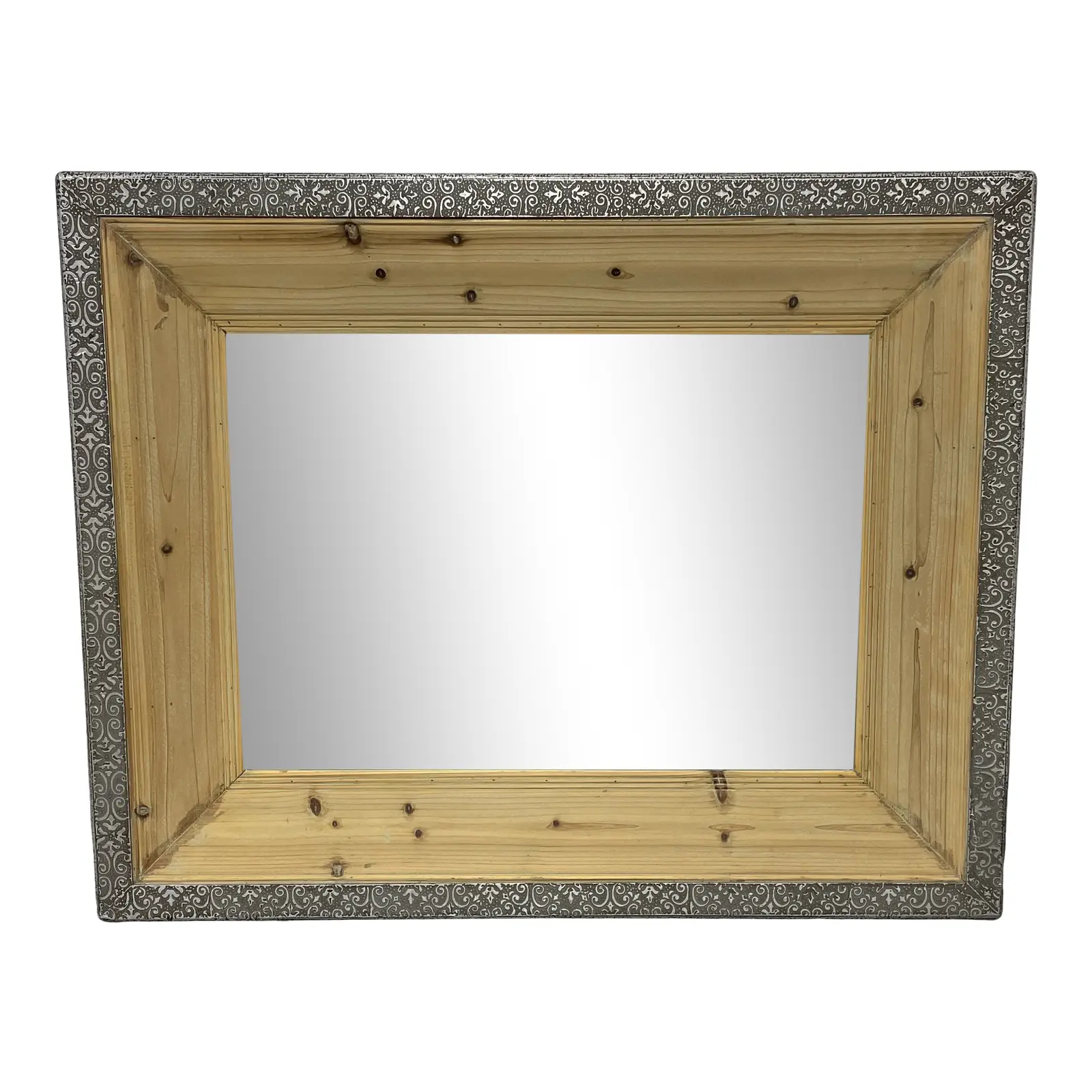 Design Plus Gallery presents a Country Chic Wood Framed + Tin Trim Wall Mirror. Mirror is wired on the back panel for horizontal orientation. Beveled glass is framed by a substantial pine trim. Beyond the trim a decorative tin is applied to the frame. Minor wear.