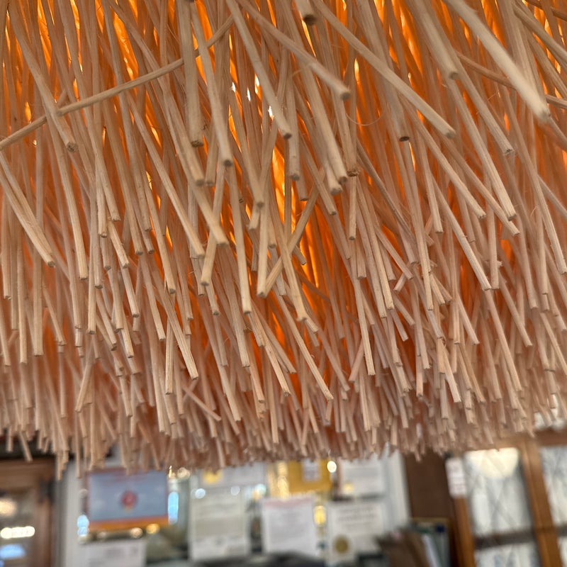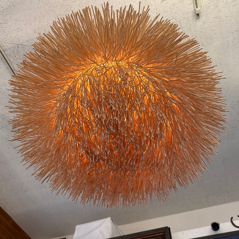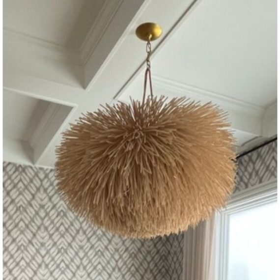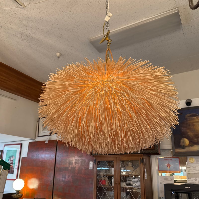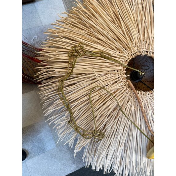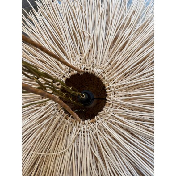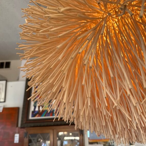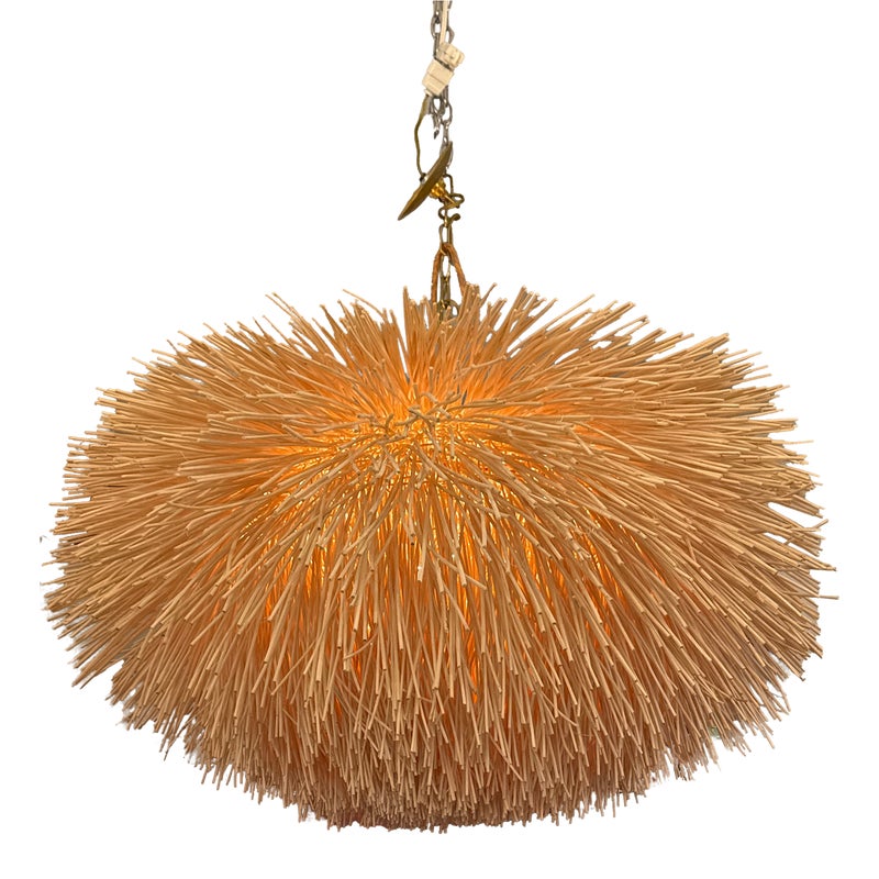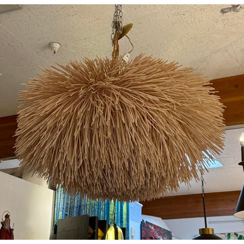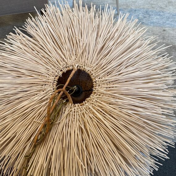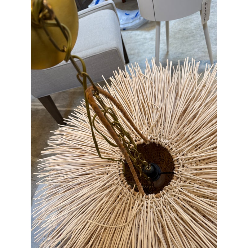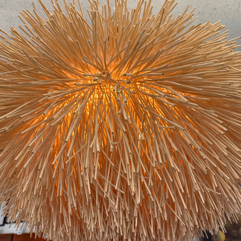 Design Plus Gallery presents the Sea Urchin Pendant by COUP STUDIO for Coup d’Etat. A natural rattan light fixture designed to resemble a sea urchin. This pendant is in their medium size with an intricately woven rattan design and antique brass hardware and matching canopy. This pendant adds an artisanal and textural element to the decor. Overall it is in good condition with minimal visible wear for its usage.