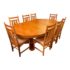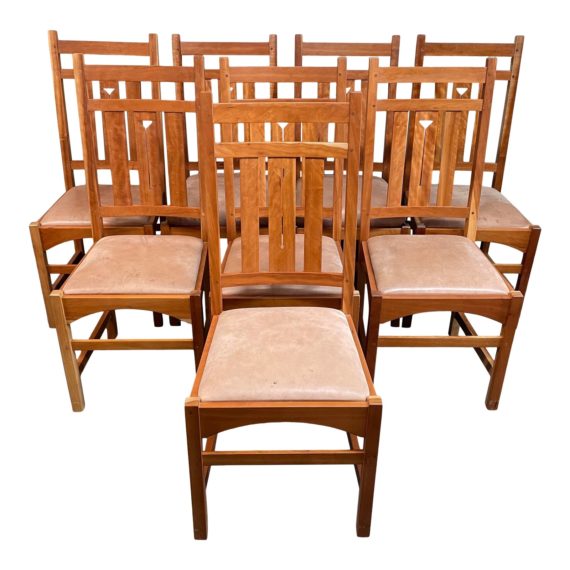 Design Plus Gallery presents a Set of Eight Craftsman House Maple Dining Chairs. Made of solid wood locally in Berkeley California. solid wood framed chairs with leather seats. Back splats have a decorative Art Nouveau inspired motif. Two have been customized even to accommodate shorter proportions with a higher seat. There is visible wear through out the upholstery, however they do remove easily for customizing with your own fabric and scheme. Minor wear through out, set is in good condition. Hand crafted in 2002.