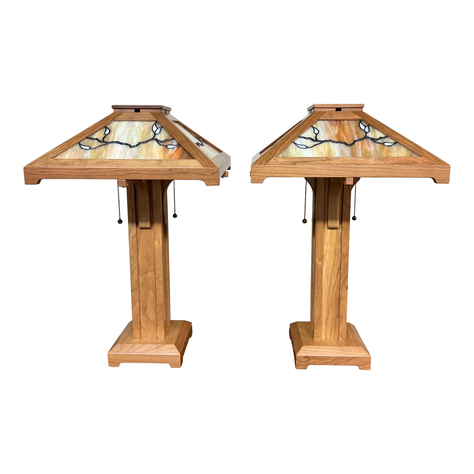 Design Plus Gallery presents a Pair of Vista Stained Glass Table Lamps by Craftsman Studio. The Arts & Crafts style table lamp is beautifully crafted from white oak with copper foil art glass shade. Each lamp has corbeled shade supports and large base with a signature craftsman style feel. Opalescent glass creates a variegated background to the twisting branches depicted. Holds two 60 watt max light bulbs with double pull chains. Little evidence of wear; condition is good for age and use.
