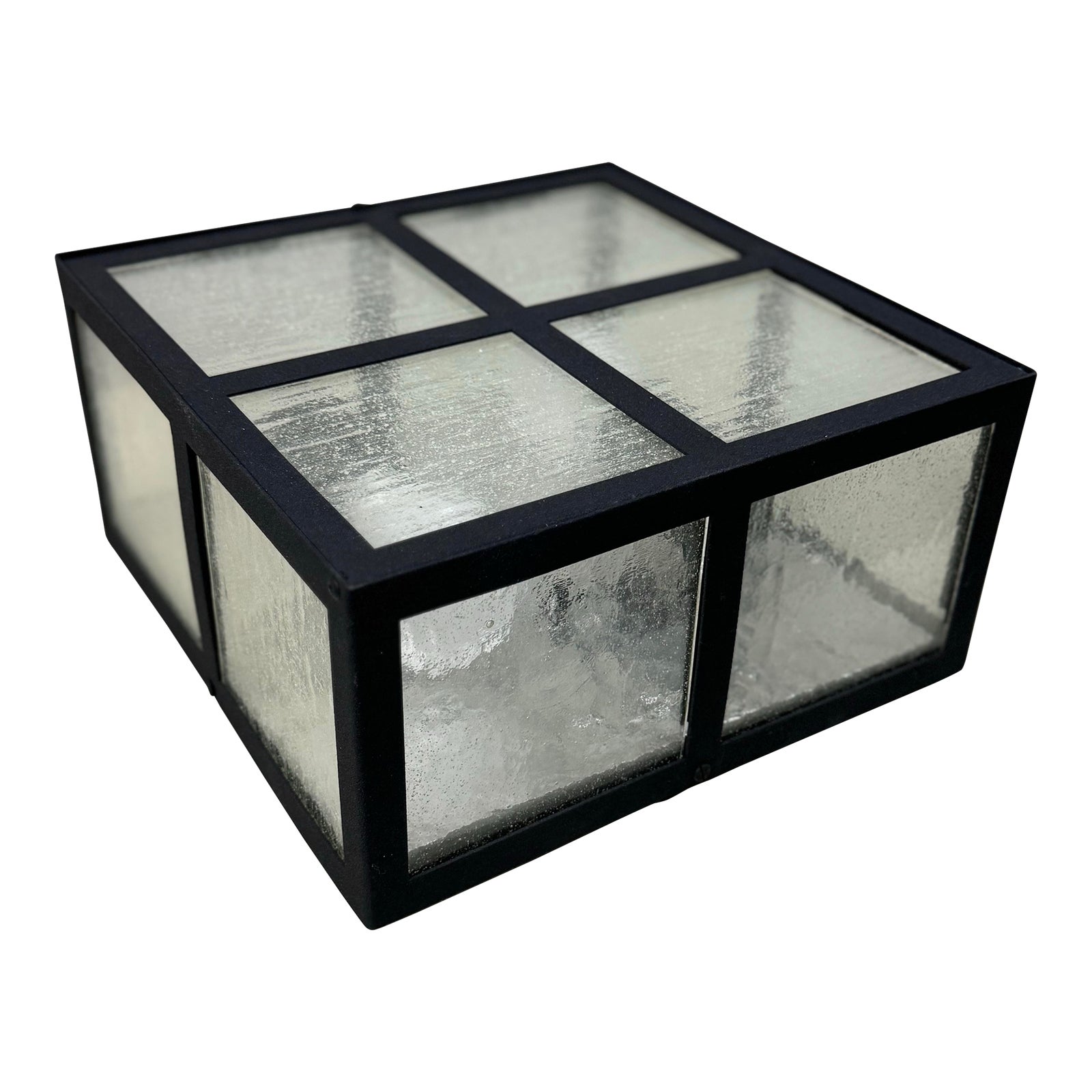 Design Plus Gallery presents a Ceiling Flushmount of Craftsman Style. Think back to the era of Frank Lloyd Wright and Edgar Miller and their artisan houses, this light fixture will fit right in. Paned glass segmented into equal sized squares with two light sources inside. The glass comes off as minimally frosted. Is in good condition with minimal wear.