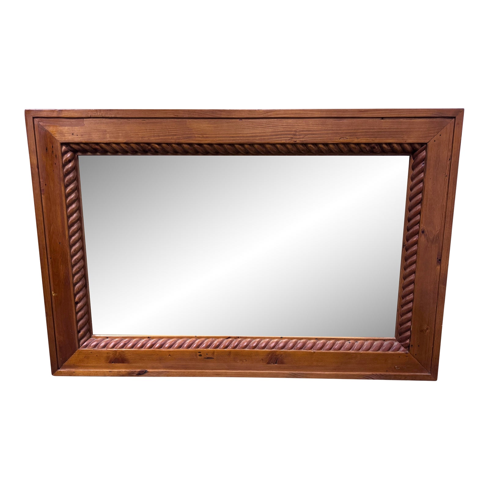 Design Plus Gallery presents a Honey Tones Solid Wood Craftsman’s Mirror. The mirror has an inner spiral for design impact with a large, thick framed border surround the carving + mirror. Would do great in a cabin over the mantle or hung horizontally with a rustic design sensibility. The mirror has wear that is typical to its use + age.