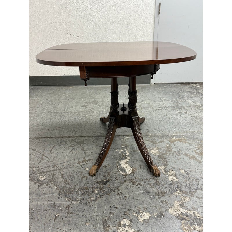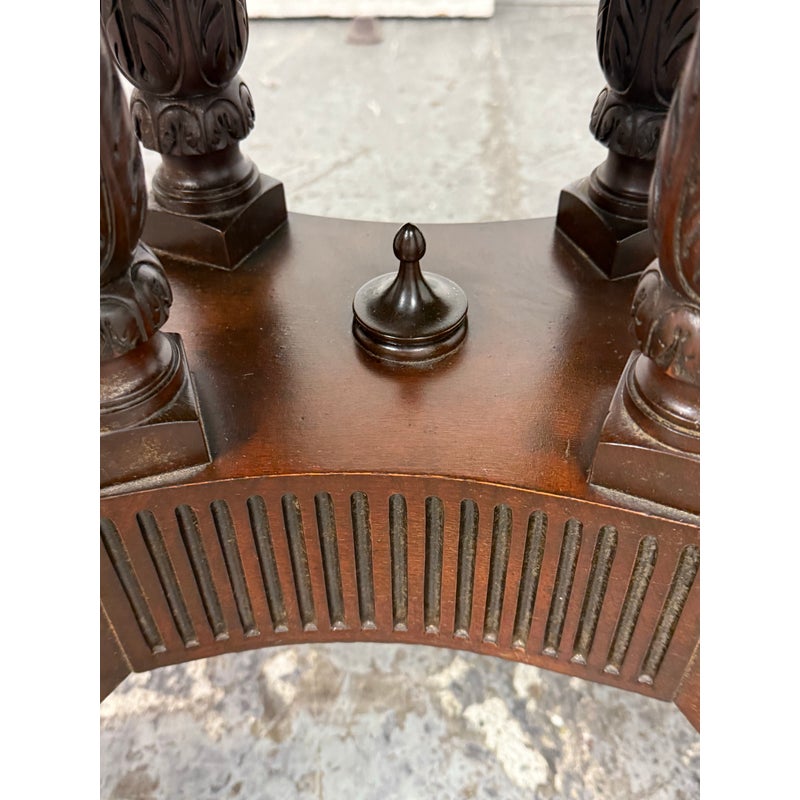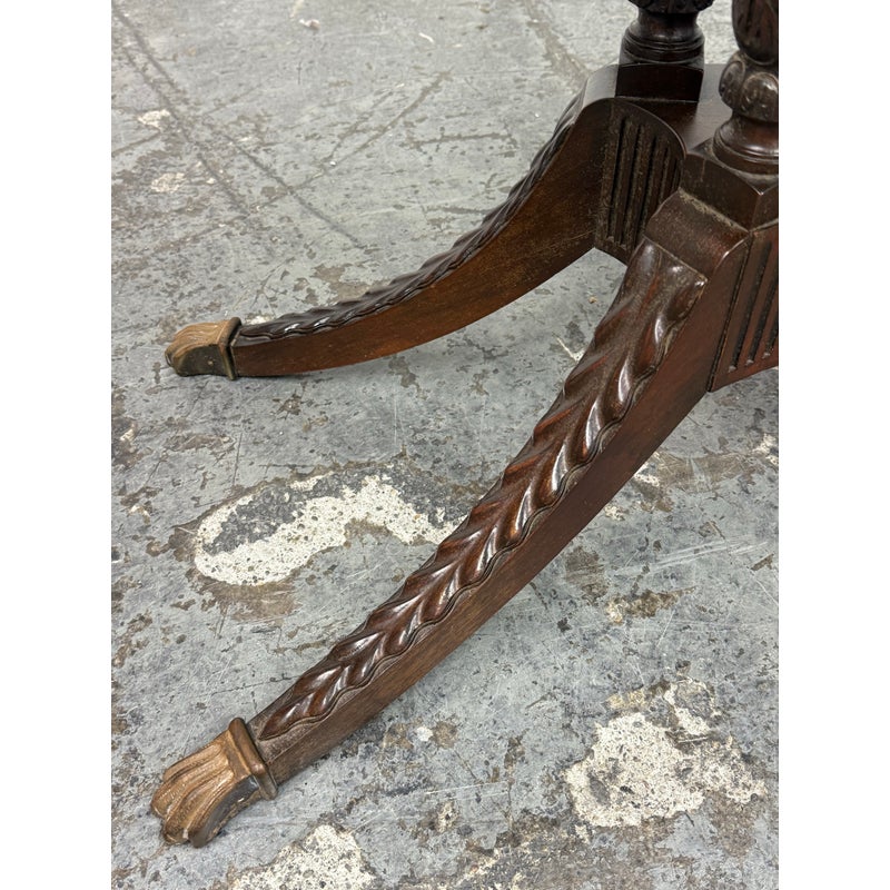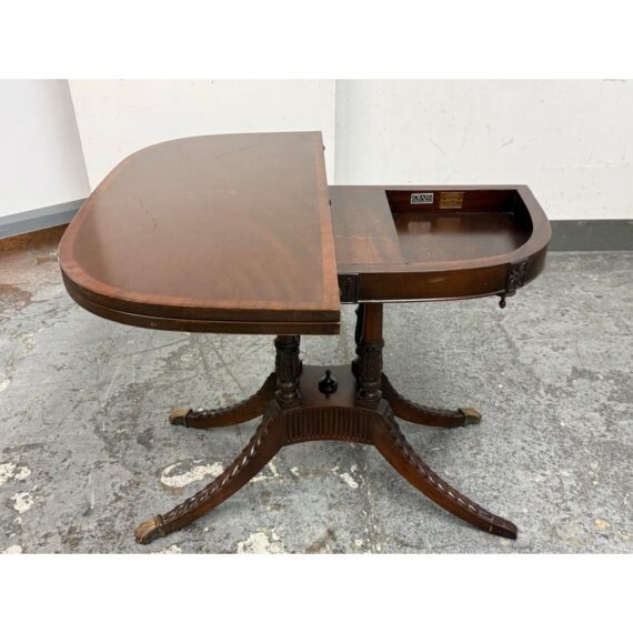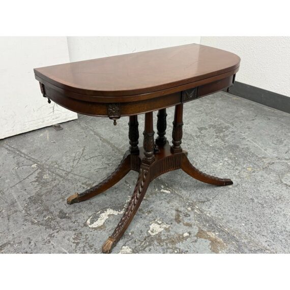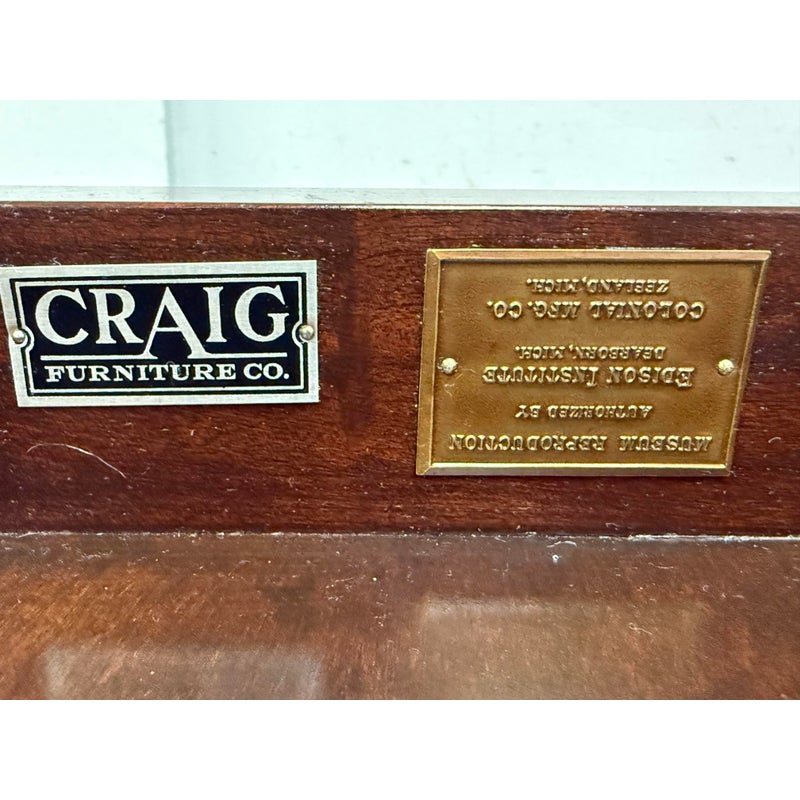 Design Plus Gallery presents a Flip Top Game Table from the 19th Century with Craig Furniture Brand Plate. This luxury piece also has a brass tag on it that certifies it as a Museum Collection piece, Edison Institute. A great luxury table that will captivate your guests for game night, each and every time. It has brass capped feet with sheaf of wheat molded legs that join into a center column. The table top twists over with a cool mechanism that reveals an interior drawer that is concealed when the top flips over, presenting you with more table surface to work on. The table is in good condition with visible surface wear that is consistent with its age. Made in the USA.