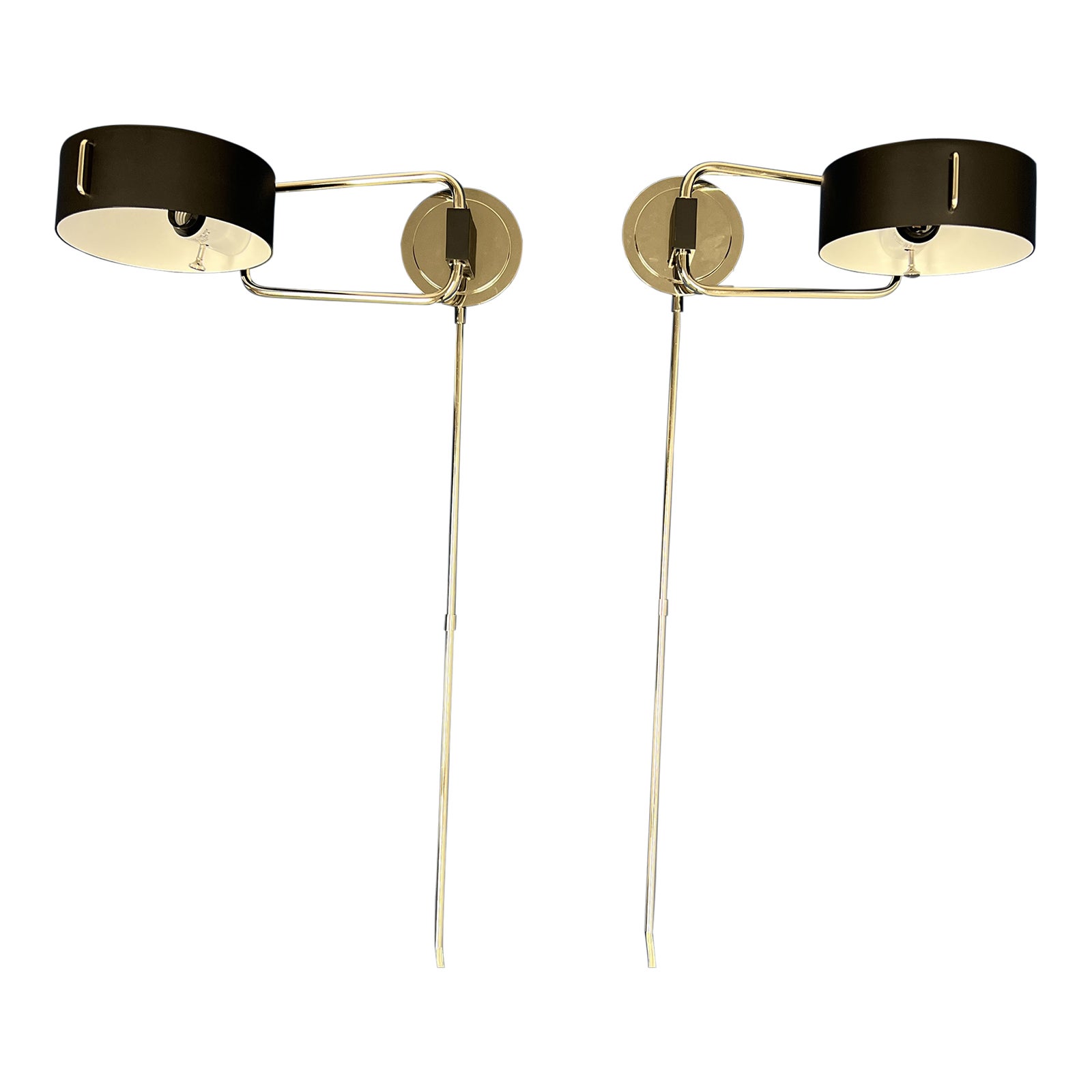 Design Plus Gallery presents a Pair of Axle Nickel Swing Arm Sconces by Crate & Barrel. Designed by Robert Abbey, adjustable sconce swings out a streamlined shade on a sleek arm of polished nickel. Finished in luxurious satin black finish, the shades have white interiors to maximize the glow. Sconce can be hardware installed or hung as a plug-in. This is a discontinued model.