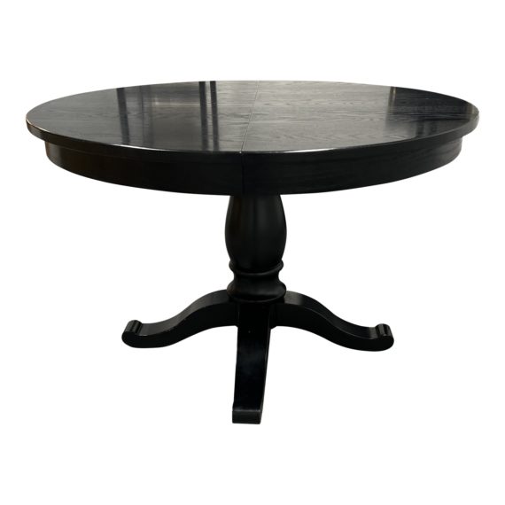 Design Plus Gallery presents an Avalon Black Round extensions Dining Table by Crate & Barrel. Avalon refines traditional 19th-century cottage styling with a sleek black painted finish, making it perfect for casual dining rooms. A curved pedestal base forms a streamlined silhouette that leads to a versatile, durable top finished in polyurethane. The expandable dining table’s deeply recessed apron and easy-glide mechanism allows four guests to sit comfortably in the round, and up to six with the 17″ leaf. The Avalon Black 45″ Extension Dining Table is designed by Blake Tovin of Tovin Design and is a Crate and Barrel exclusive. Minor wear from usage.