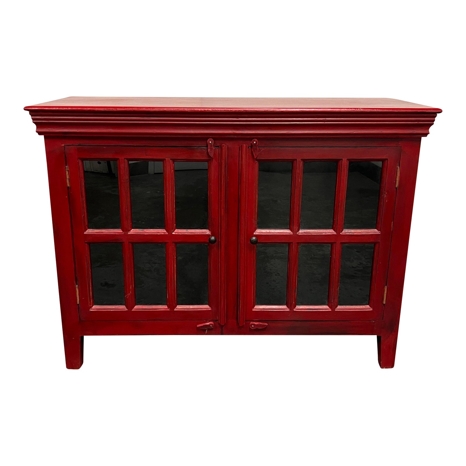 Design Plus Gallery presents a Rojo Red Media Storage Cabinet by Crate & Barrel. This versatile console has glass doors pairs suitable for storage, media or display of prized possessions. Painted and lightly distressed , the cabinet interior is black with exterior that exhibits a rustic matte red finish. Cord access. Minor wear from usage.This is a discounted model.