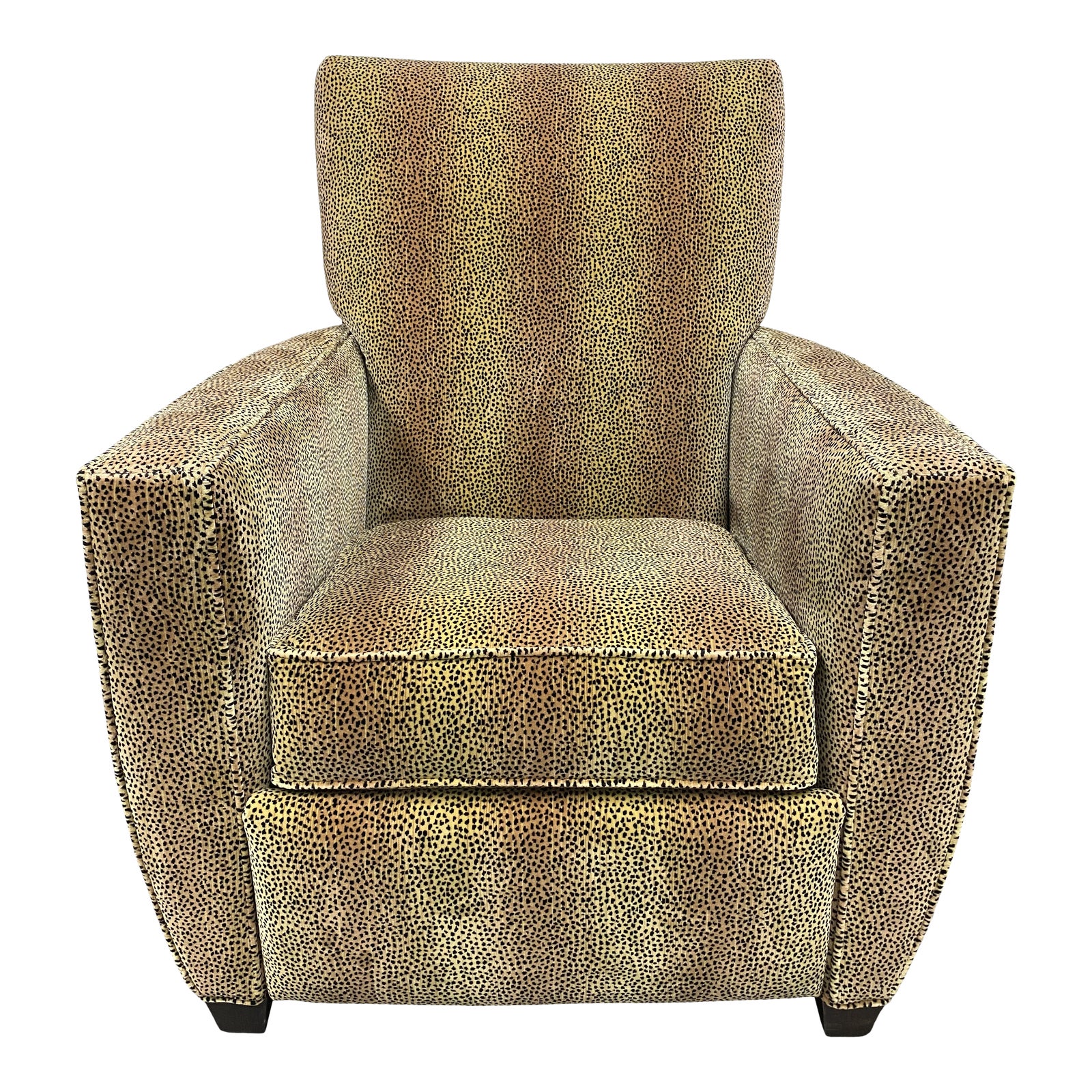 Design Plus Gallery presents a Crate & Barrel Animal Print Recliner Chair. A fun and soft velvet animal print is upholstered around the streamlined recliner frame. With a simple push on the ground the seat comfortably reclines back for nap time and relaxation. Narrow foot print keeps the space nice and open while offering excellent back support. Minor wear, good condition.