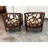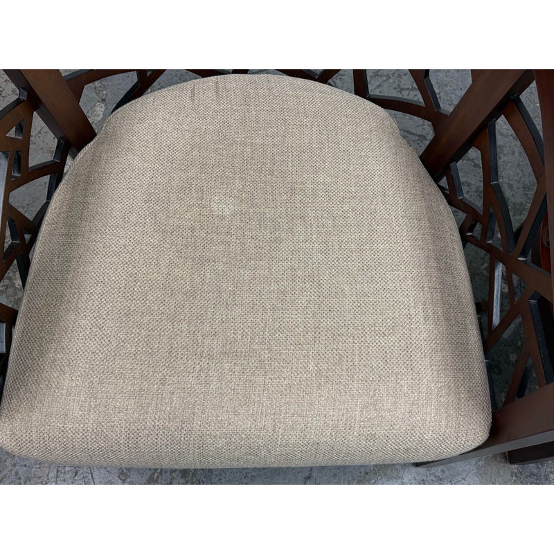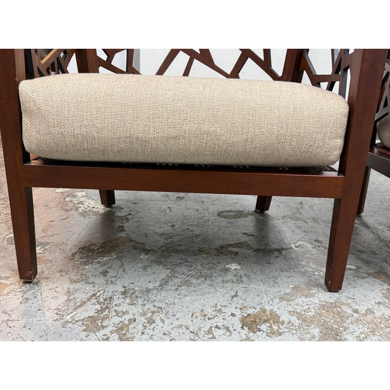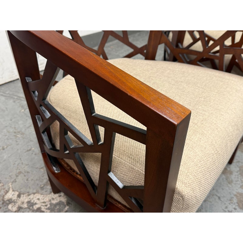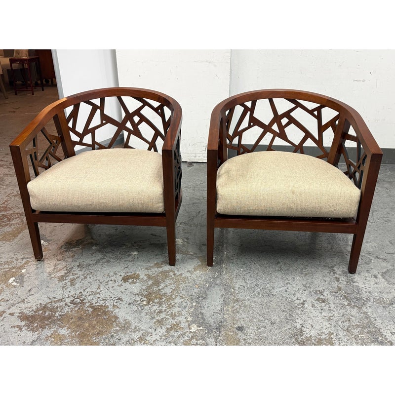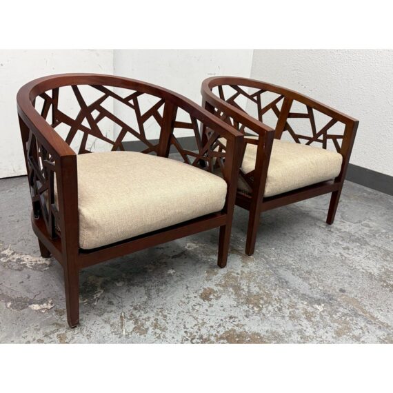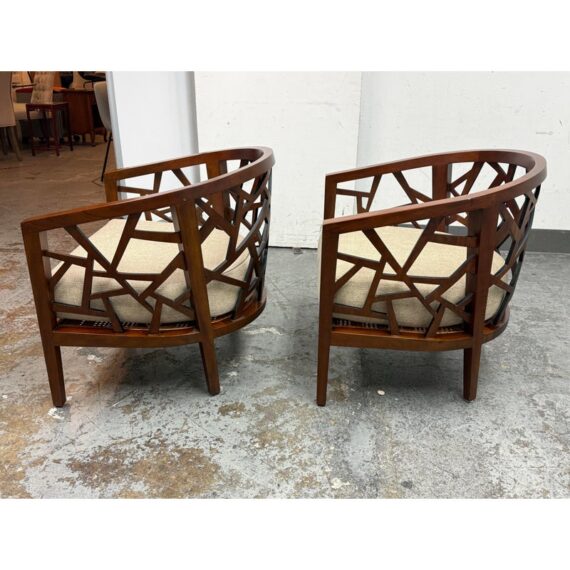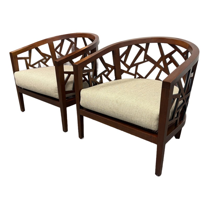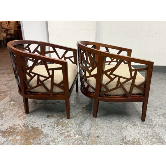 Design Plus Gallery presents a Pair of Ankara Chairs from Crate & Barrel. The chairs were designed to be appreciated from every angle. They offer an intricate open curve of hand-cut and hand-pieced hardwood that opens up to an artistic and architectural 360-degree view in the living room. The chair’s geometric barrel design is inspired by Indonesian mosaics and handcrafted by the island’s skilled artisans of solid ash with a walnut finish. Their handwoven tropical cane seats hosts a comfortable thick seat cushion, upholstered in a heavyweight blend of rayon, flax, and cotton that yields slight luster. This style of chair is no longer in production with the brand. Visible wear to the cushions is present but overall they are in good condition for their usage.
