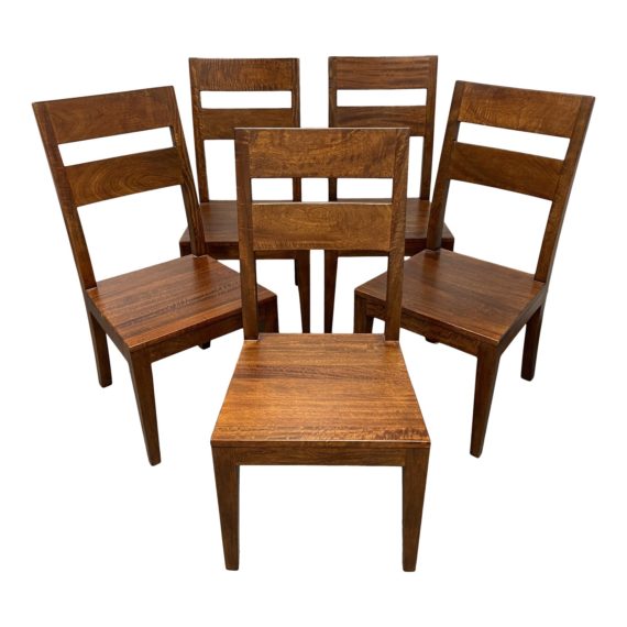 Design Plus Gallery presents a Set of Five Basque Honey Wood Dining Chairs by Crate & Barrel. Handcrafted of sustainable solid mango wood with a rich honey finish, Basque recalls the simple, rustic character of a European farmhouse antique. A strong, yet comfortable presence with generous proportions, a tall, modified double-slat back and deep seat. Comprised of unique, hand-planed planks with authentic peg detailing and natural grain and knotting. Accompanied with a removable seat cushion. The Basque Honey Wood Dining Chair is a Crate and Barrel exclusive. Made in Indonesia.