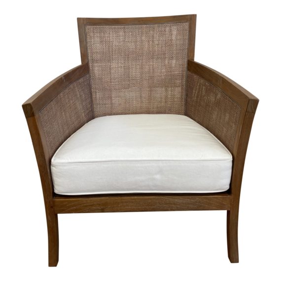 Design Plus Gallery presents a Blake Grey Wash Rattan Chair with Fabric Cushion by Crate & Barrel. Handwoven rattan panels adorn the sustainably sourced teak frame with a tropical appeal. A taupe wash gives an elegant weathered look. Subtly curved frame is handcrafted in Indonesia using only plantation-grown solid teak certified by the Forest Stewardship Council. A bright white cotton cushion relaxes with leisurely support in a tailored with crisp self-welting. There is some light wear on the fabric and the wood frame has visible wear (pictured.) Made in USA and Indonesian.
