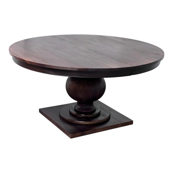 Design Plus Gallery presents a Crate & Barrel Winnetka Dining Room Table of Dark Mahogany. This dining room table immediately elevates the dining room with its classic, elegant presence. The round dining table is crafted of solid mahogany certified by the Forest Stewardship Council (FSC) and finished light honey brown stain with a subtle grey wash to bring out the wood’s open grain and knots. Designer Blake Tovin’s richly appointed round table showcases a dramatic turned base and gracious tabletop. Was a Crate and Barrel exclusive. In good condition with some scratches and at present, extension leaf is not available.