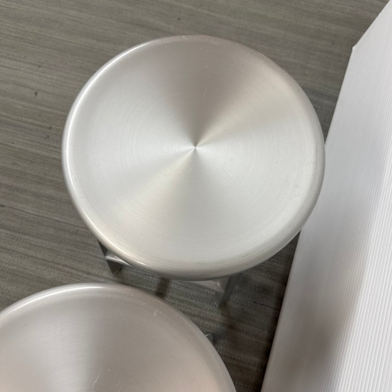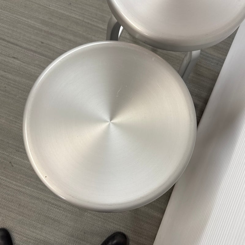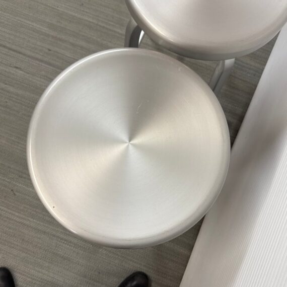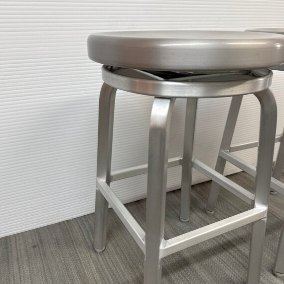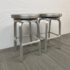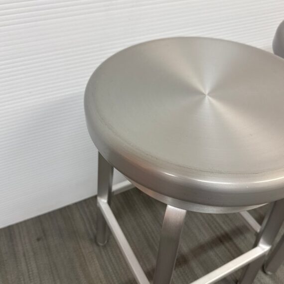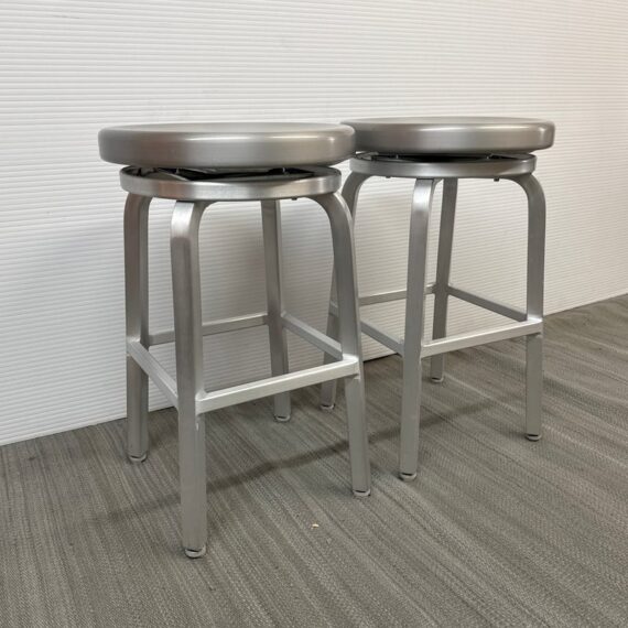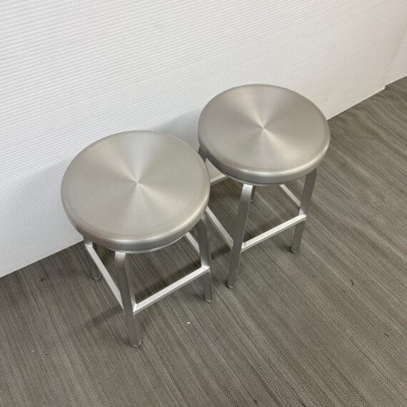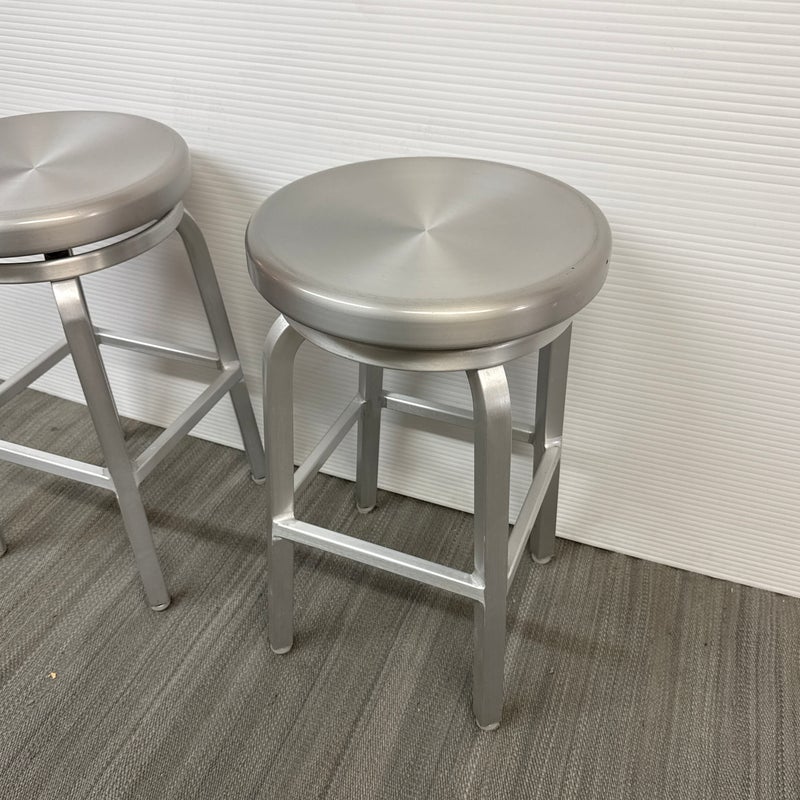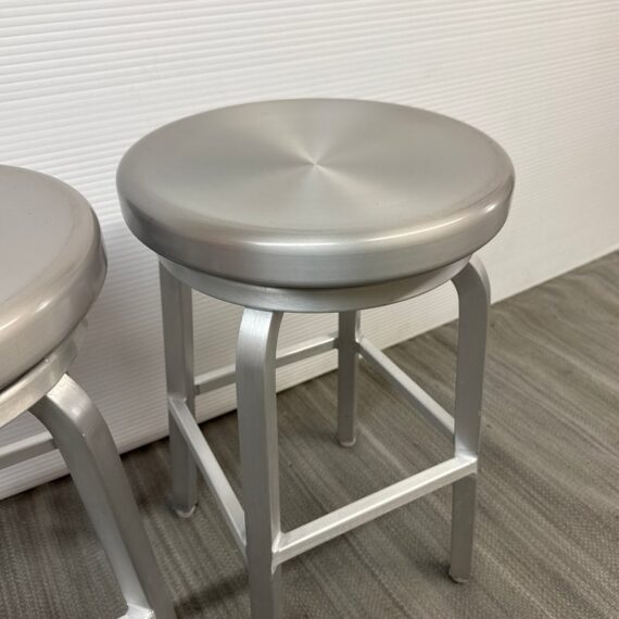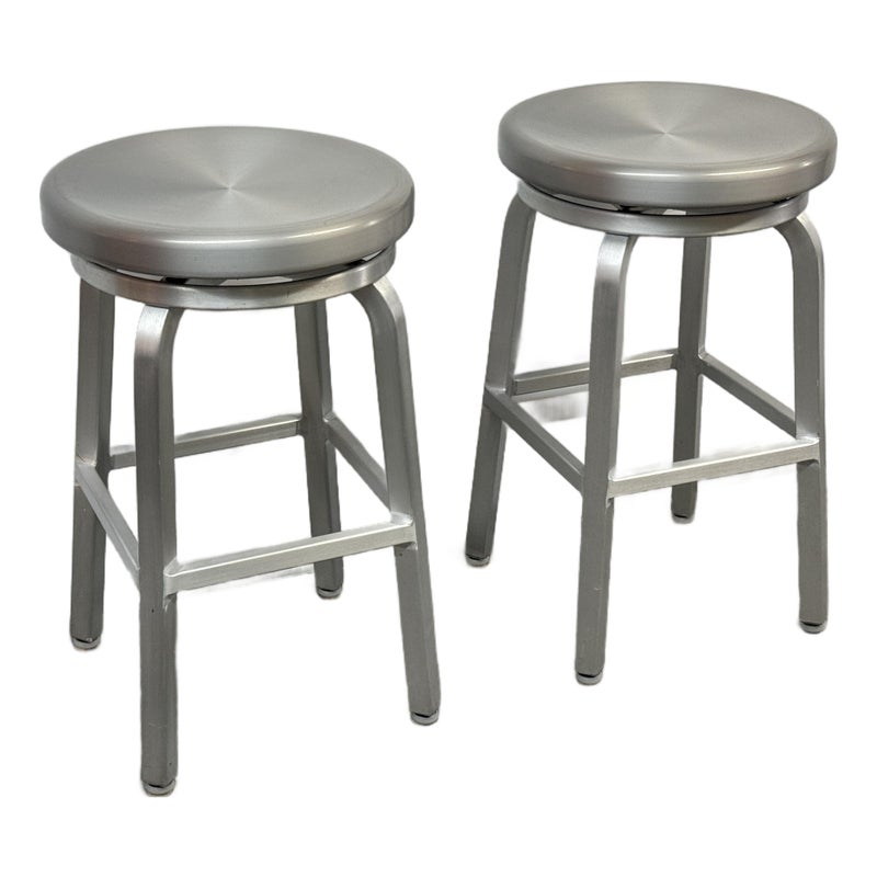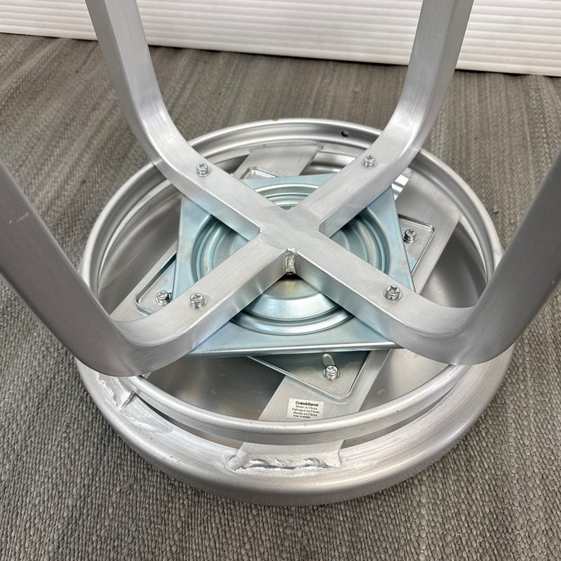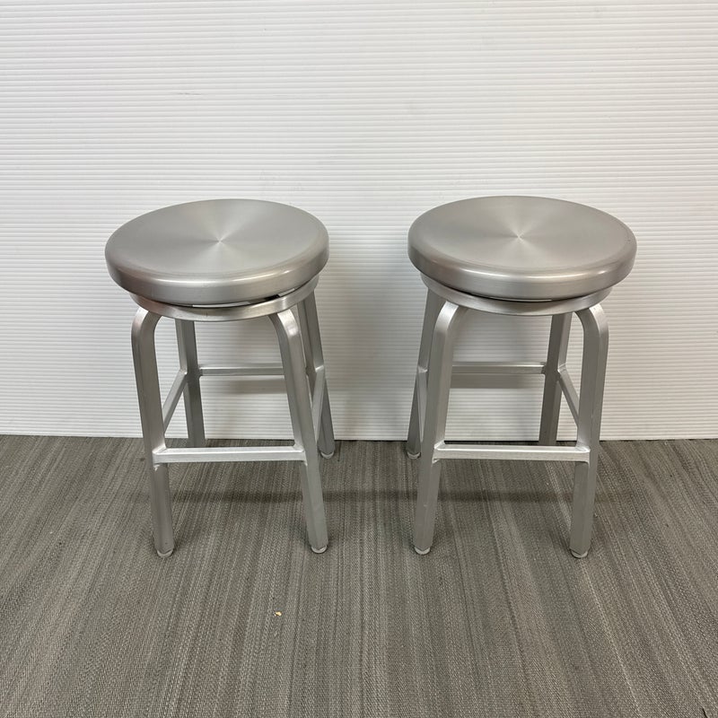Design Plus Gallery presents a Pair of Crate & Barrel Counter Stools. The are sleek with a modern frame that can compliment use for in or outdoors. They have flexibility in their use due to their desirable light weight while durable foundation. Both are in good conditon with wear that is consistent with usage.