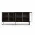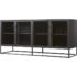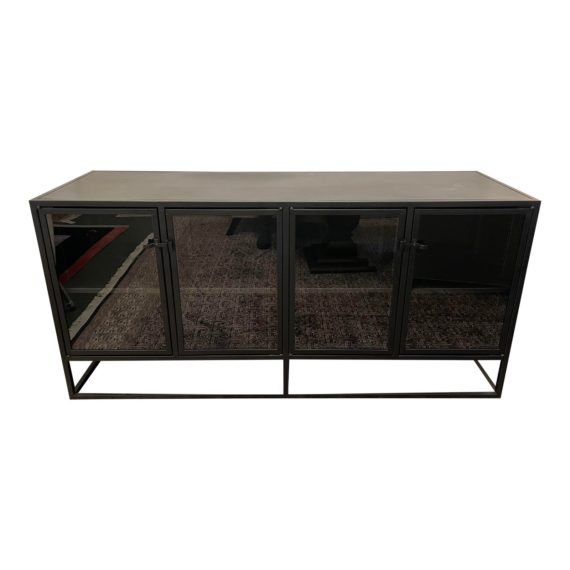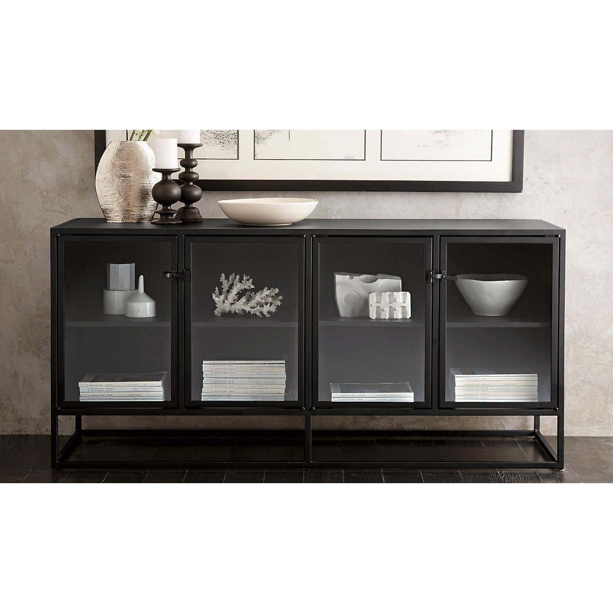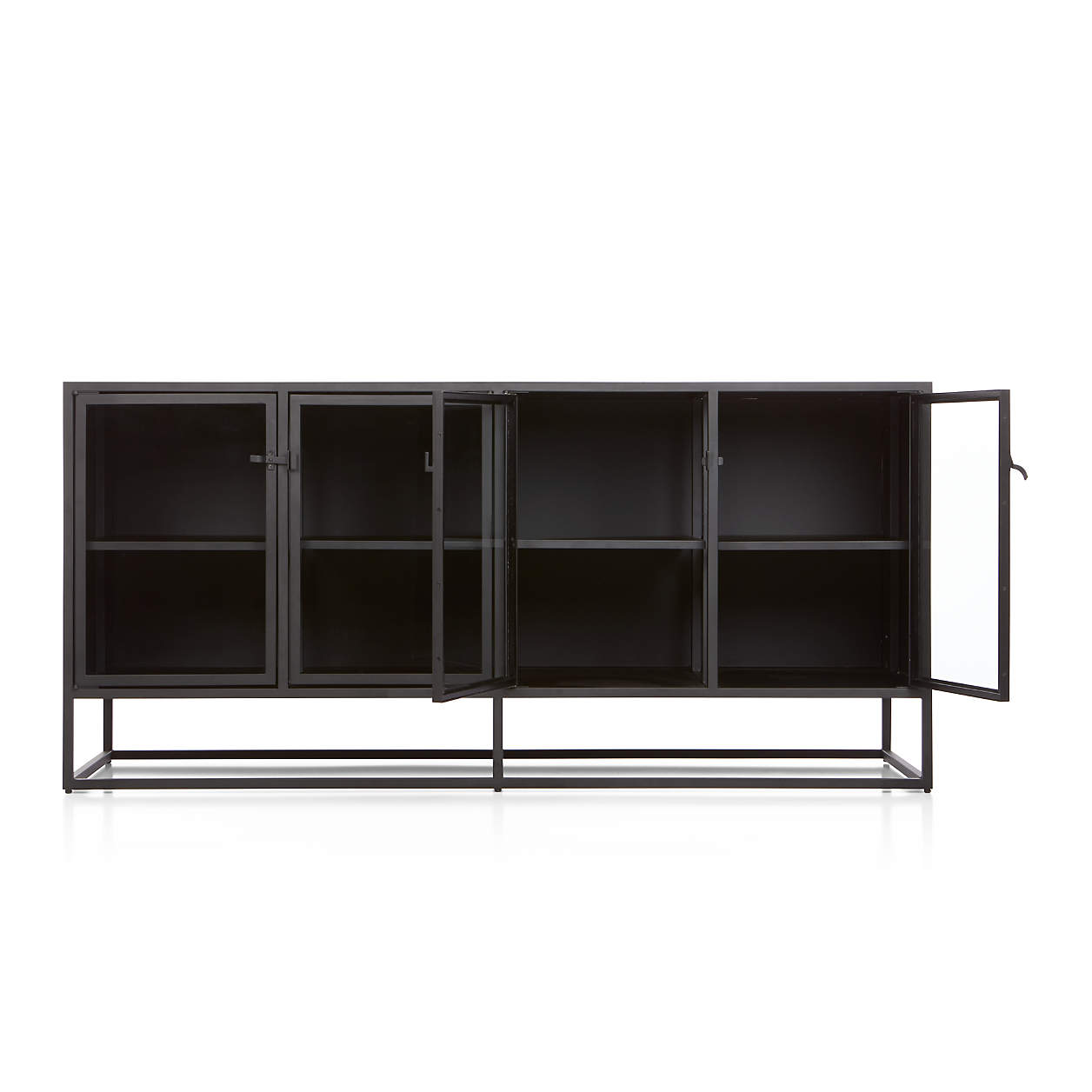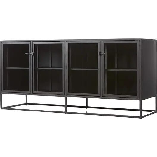 Design Plus Gallery presents a Crate & Barrel Casement Black Large Sideboard. Influenced from the architectural lines of French Casement windows. Latched hardware opens to showcase and store with adjustable shelving on the interior. Designed by Paul Schulman of Schulman Design, the sideboard displays prized pieces inside or on top and sharply contrasts with a black powder coat on steel. Comes with cord managament cut outs on the back panel as well. There is visible wear on the top of the unit (pictured.) Made in Taiwan. Six levelers on the base for adjusting with uneven floors.
