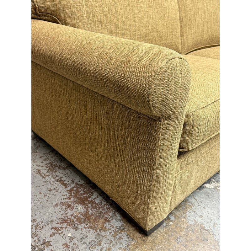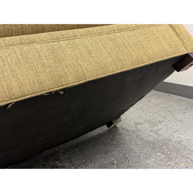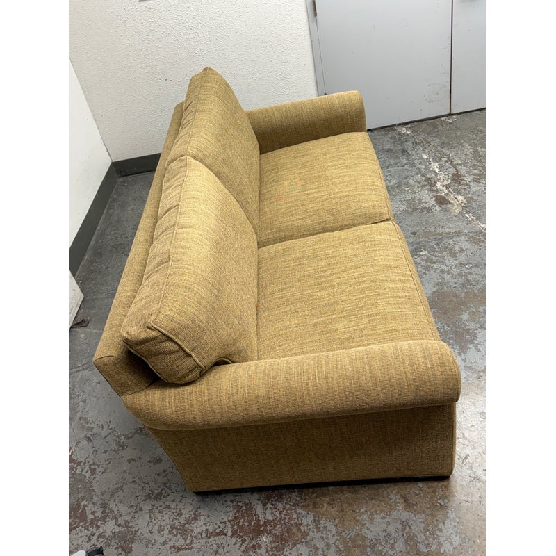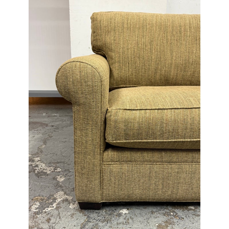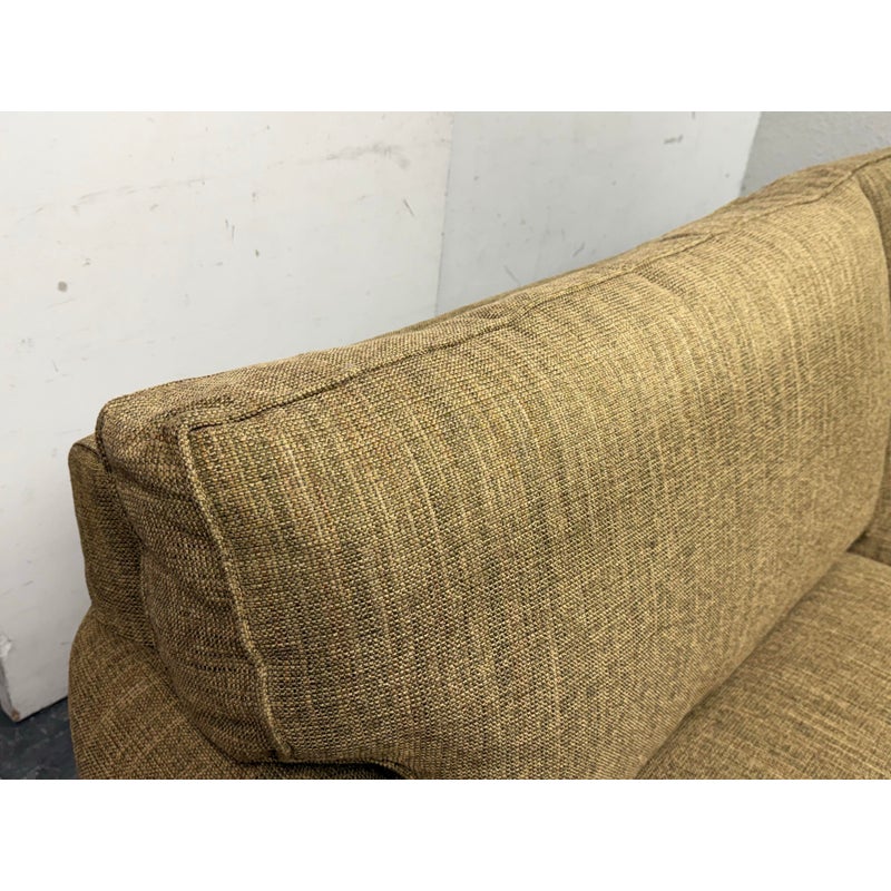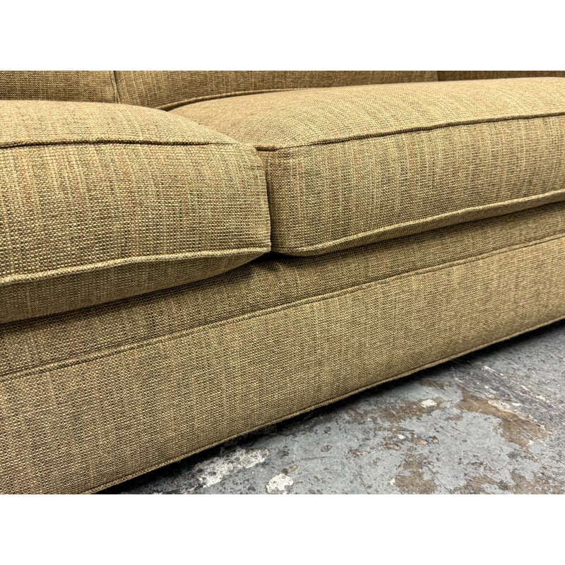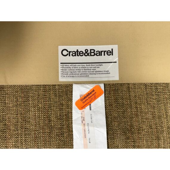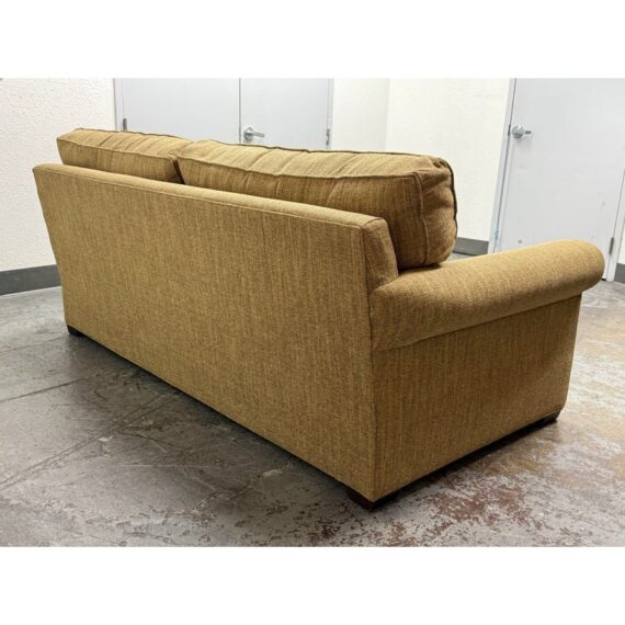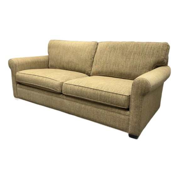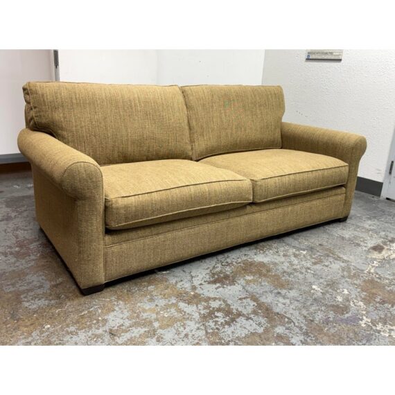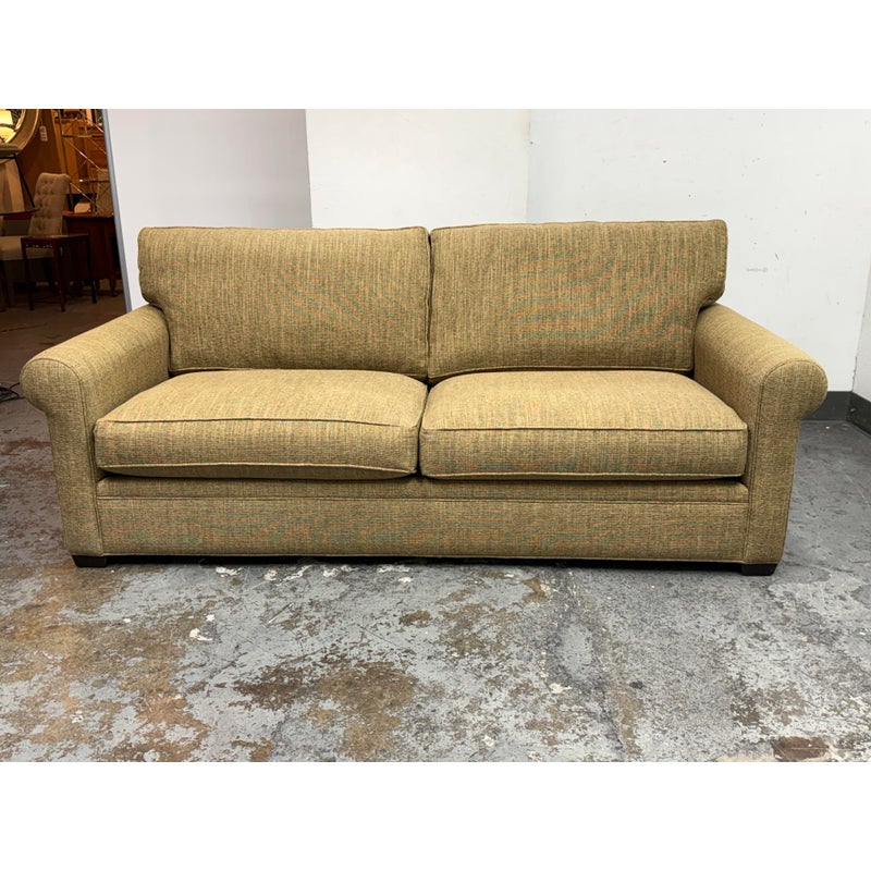Design Plus Gallery presents a Down Filled Sofa from Crate & Barrel. The sofa has rolled arm with two x two seat cushions that are removable and filled with down feathers and fill. The sofa is completely upholstered over its wooden frame with a gold tan tweed upholstery. This style is no longer in production with the brand. There is some minor sun exposure present but overall the sofa is in good condition for its age + use.