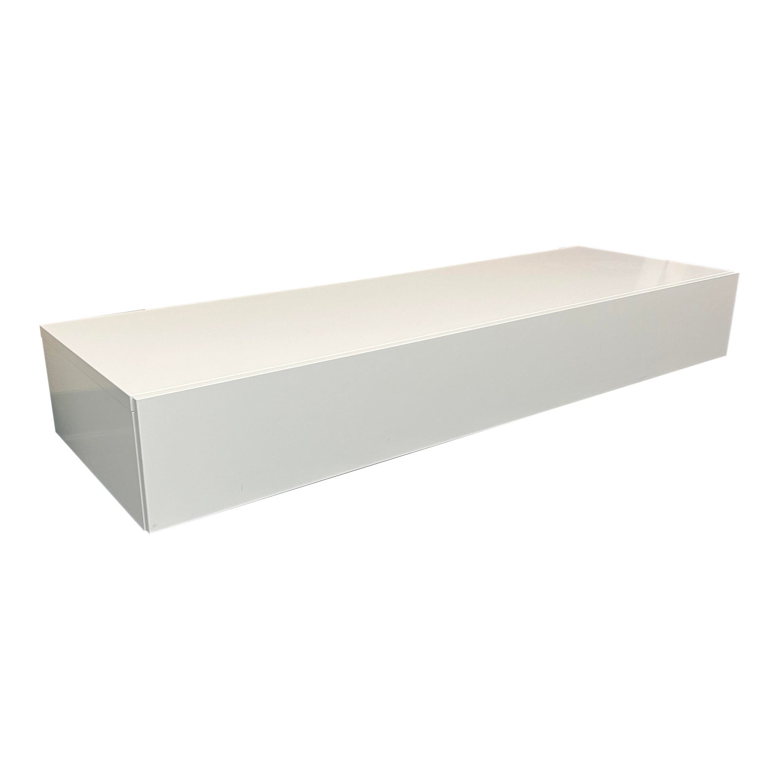Design Plus Gallery presents a District Bookcase by Crate & Barrel. Designed in a timeless contemporary style, the low storage offers two cubbies behind a slow hinged drop front panel. Great for toys, shoes or books, the back is vented. Bright white works in most settings; medium density fiberboard for durability. Light evidence of surface wear; condition is consistent with age and use.