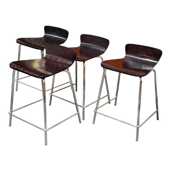 Design Plus Gallery presents a Set of Four Felix Counter Stools from Crate & Barrel. The dark wood grained molded wood seat of the chairs offers a shallow back rest for a comfortable rest. The entirety of the chair is on chrome legs that offer foot rest all around. In good condition with minimal signs of wear.