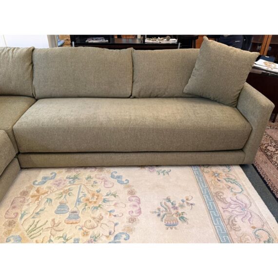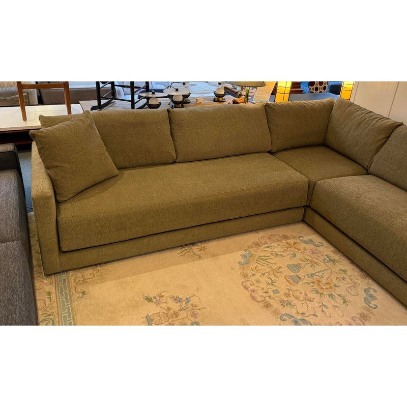 Design Plus Gallery presents the Gather Three-Piece L-Shaped Bench Sectional Sofa from Crate & Barrel. This contemporary sectional pairs wide track arms with deep bench seating and plush fiber-filled back cushions for a relaxed, inviting profile. The seat cushions are built with inner-coil construction for lasting support and comfort, while the neutral woven upholstery gives the piece an understated, versatile look. Its generous scale and streamlined lines reflect the Gather collection’s modern sensibility. It is in good condition with visible, minimal wear from usage.