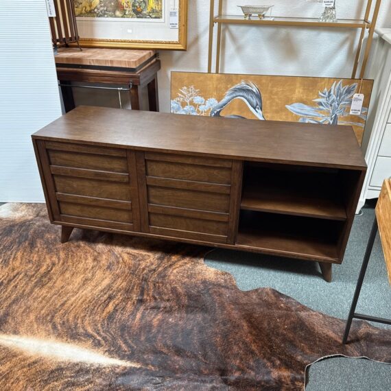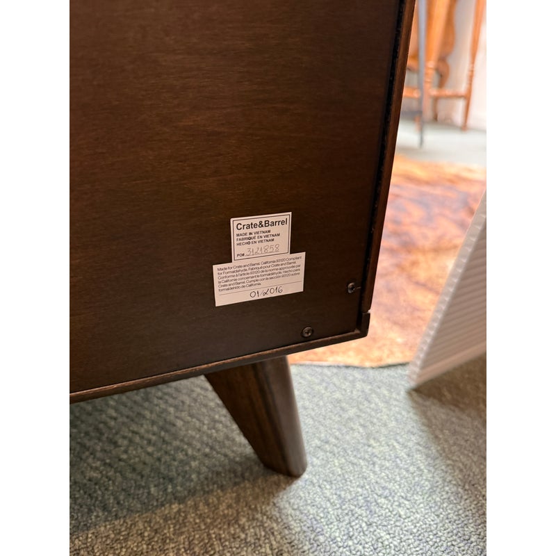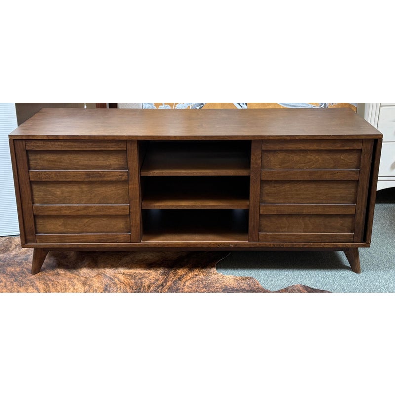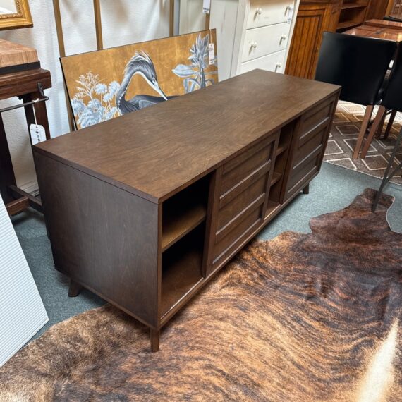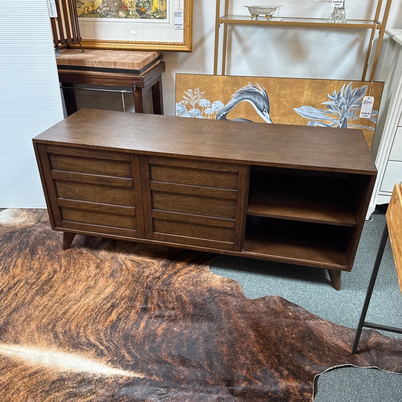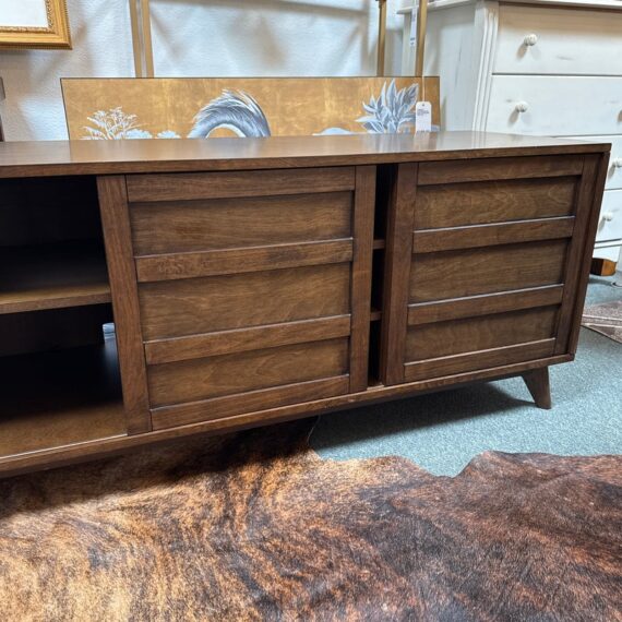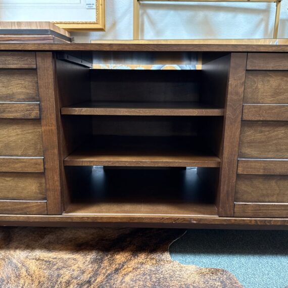 Design Plus Gallery presents a HD Media Console from Crate & Barrel. The console is a medium brown finish cabinet that has a set of two sliding doors, to neatly tuck away household items. There are two center shelves and a single shelf on the left and right side for display of game consoles, electronics, or displayable objects, and/or books. The style has been discontinued by the brand. Is in good condition with visible surface wear present that is consistent with usage.