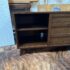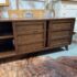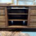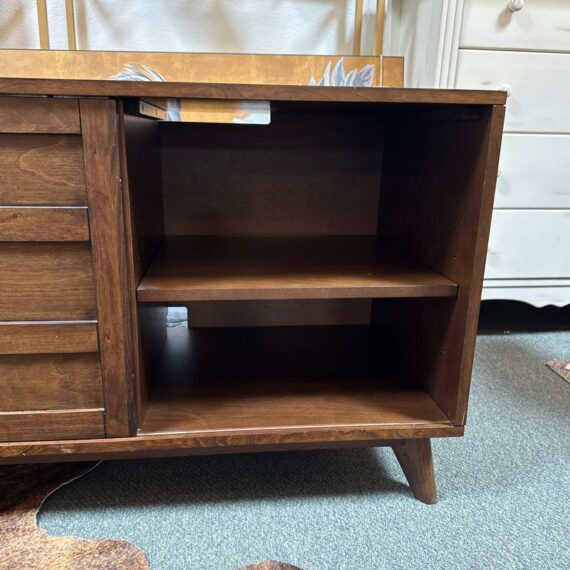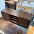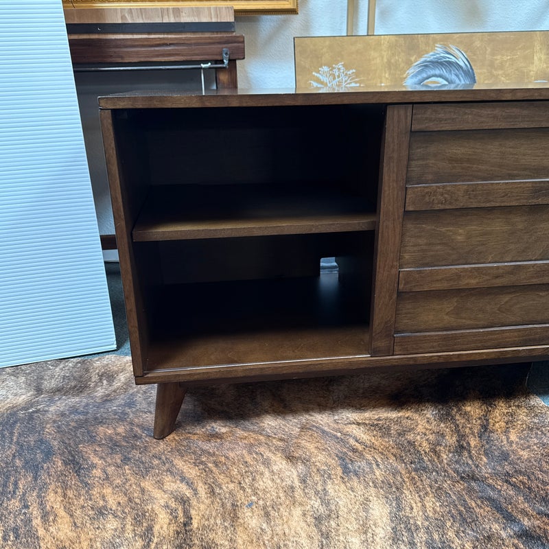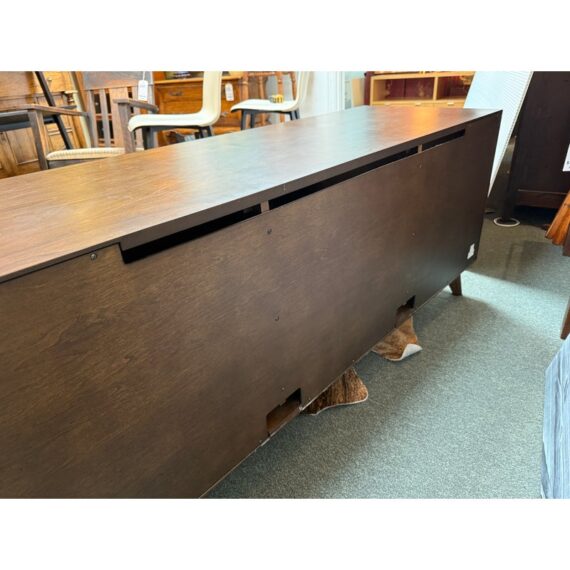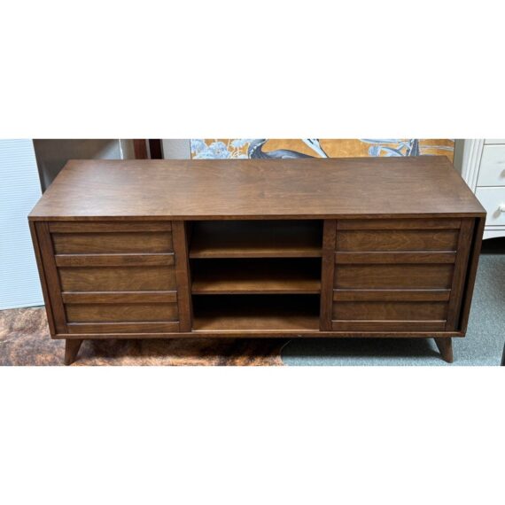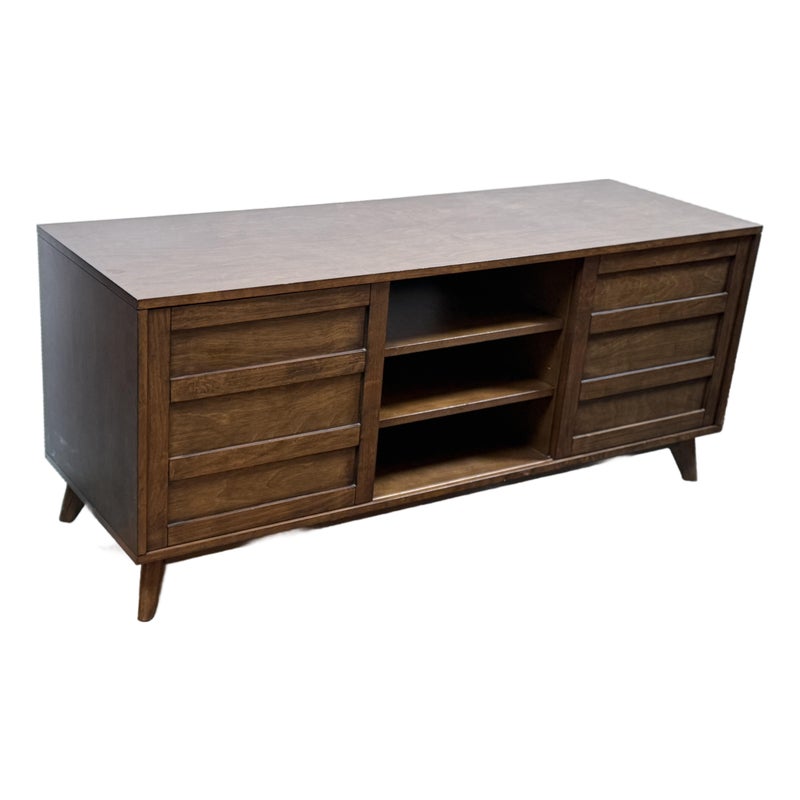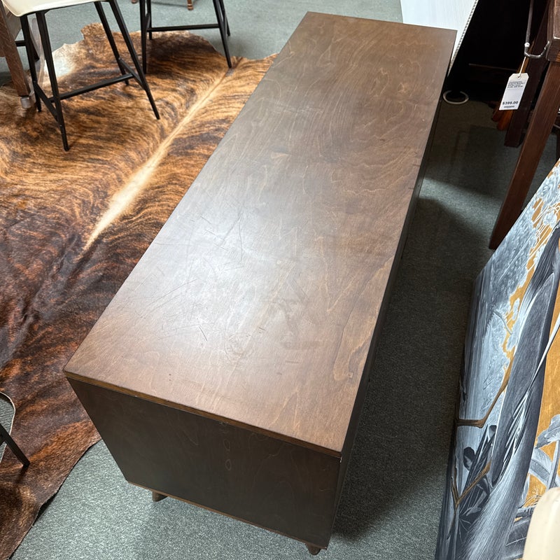 Design Plus Gallery presents a HD Media Console from Crate & Barrel. The console is a medium brown finish cabinet that has a set of two sliding doors, to neatly tuck away household items. There are two center shelves and a single shelf on the left and right side for display of game consoles, electronics, or displayable objects, and/or books. The style has been discontinued by the brand. Is in good condition with visible surface wear present that is consistent with usage.