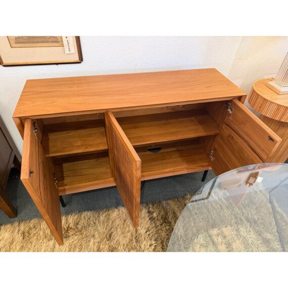 Design Plus Gallery presents a Kenan Teak Credenza from Crate & Barrel. A teak façade showcases a dynamic, hand-drawn pattern of perpendicular lines set against a dark-stained backing for rich dimension. Crafted with FSC-certified solid teak, teak veneer, and mahogany veneer, the three-door credenza rests on a slim black steel base. Thoughtful details, like concealed indented pulls, adjustable storage, and cord access make Keenan as functional as it is striking, whether styled as a buffet, bar, or media console. In good condition, visible and minimal wear from usage. Made in Indonesia