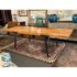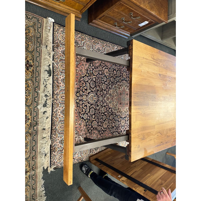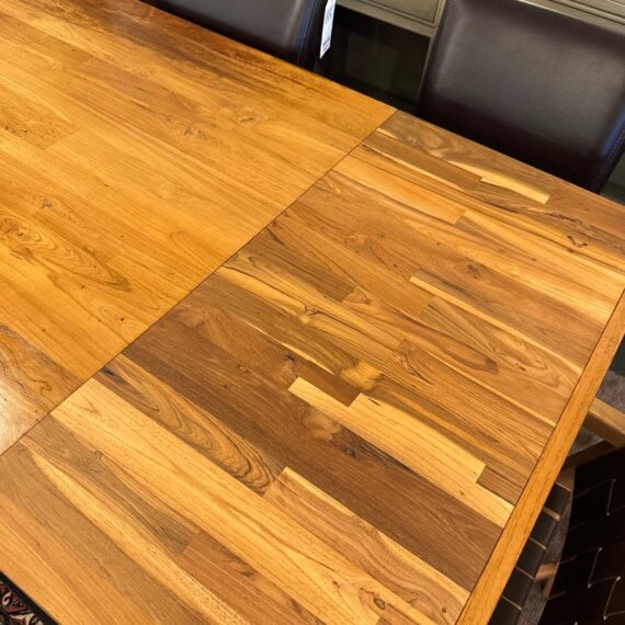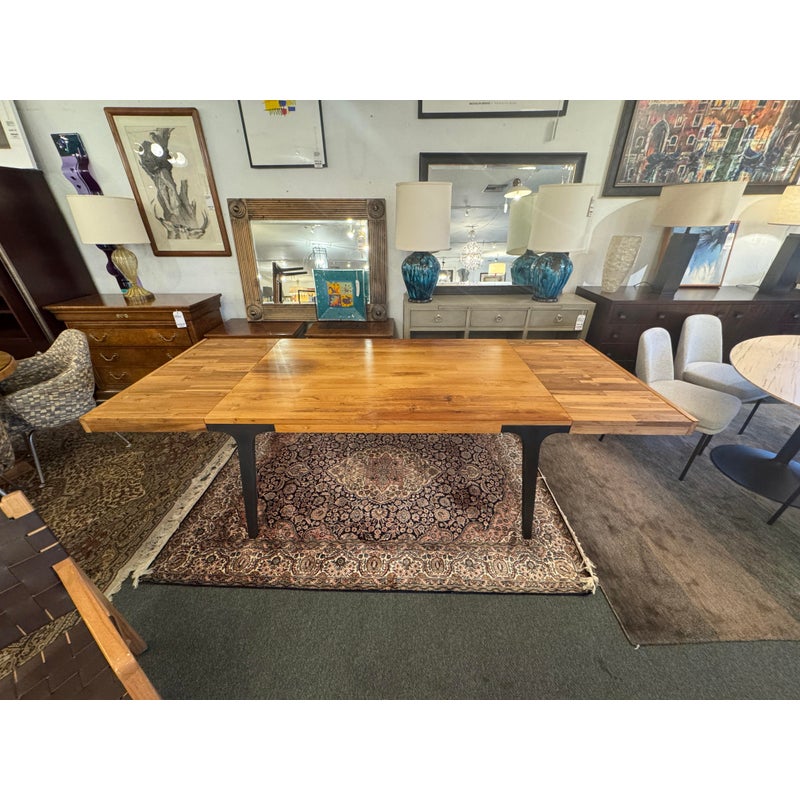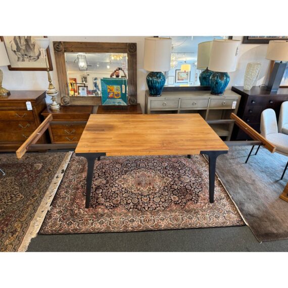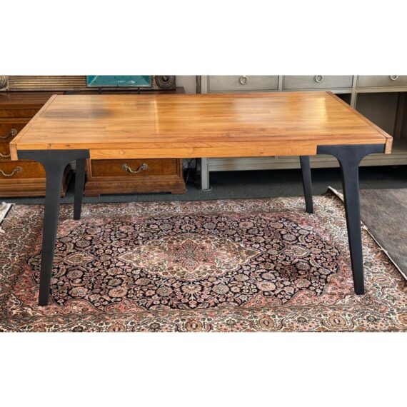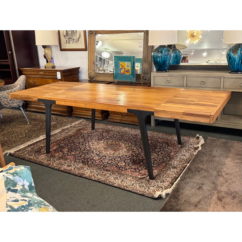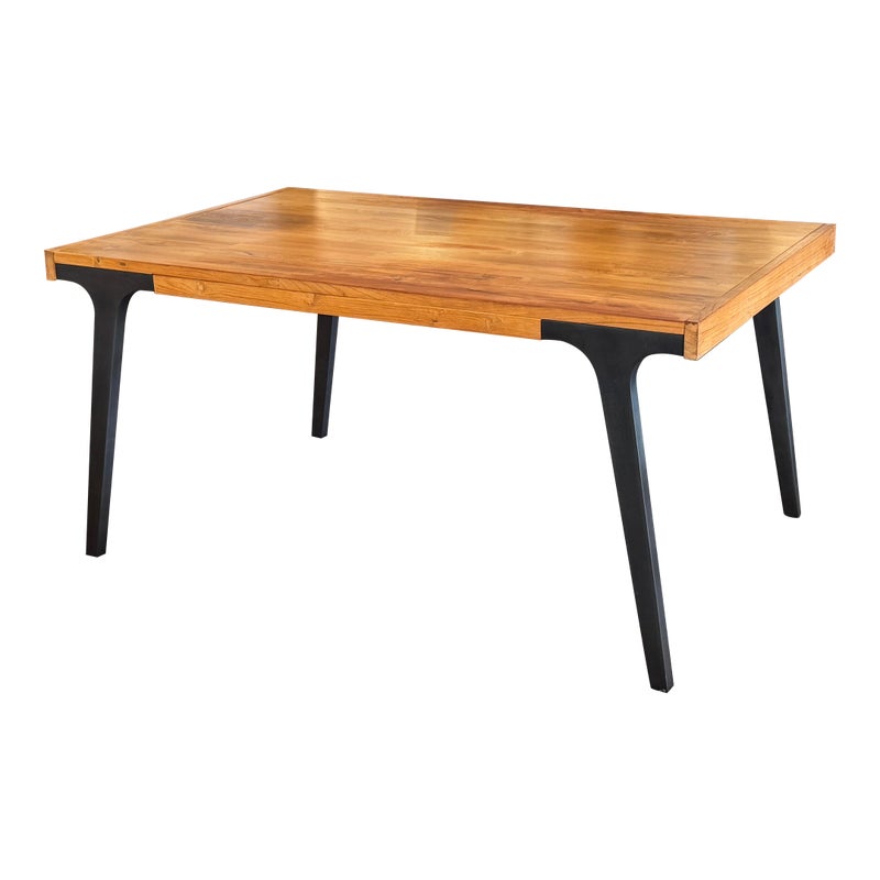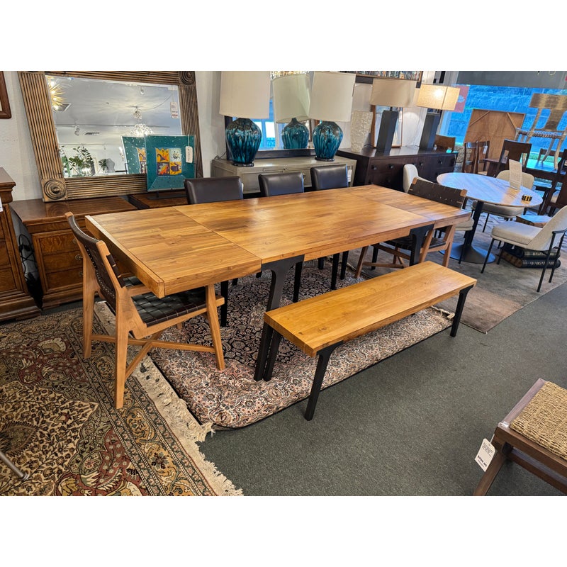 Design Plus Gallery presents the Lakin Extension Dining Table by Crate & Barrel. Interpret as either farmhouse forward or mixed-material modern organic, this table strikes a sophisticated balance between wood and metal. The antiqued finish aluminum angled frame supports the repurposed hand-selected teak boards that are sanded, buffed and waxed to a warm glow. Two leaves that expand the table to seat extra guests. Madein India. Visible surface wear and stains, leaves haven’t aged to match. Made in India.