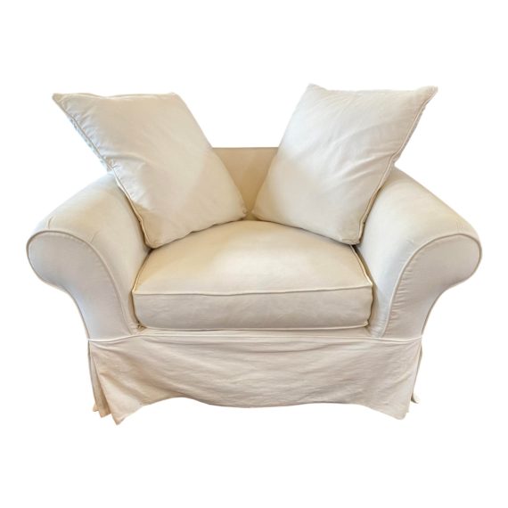 Design Plus Gallery presents a Comfy Lounge Chair by Mitchell Gold for Crate & Barrel. A skirted slipcover in white duck wraps this chair and a half and a pair of large decor pillows. A cloud that invites relaxation.