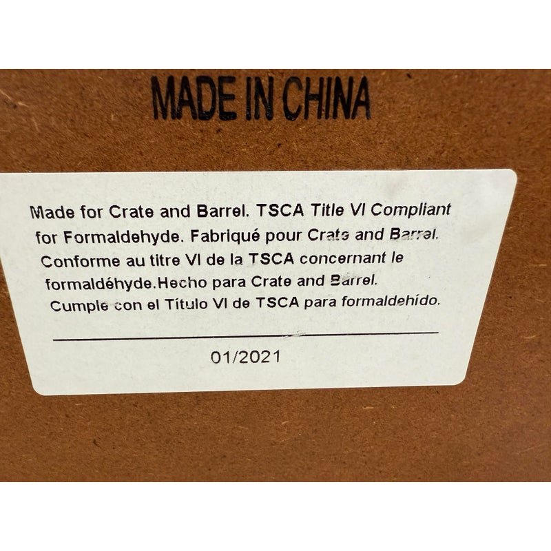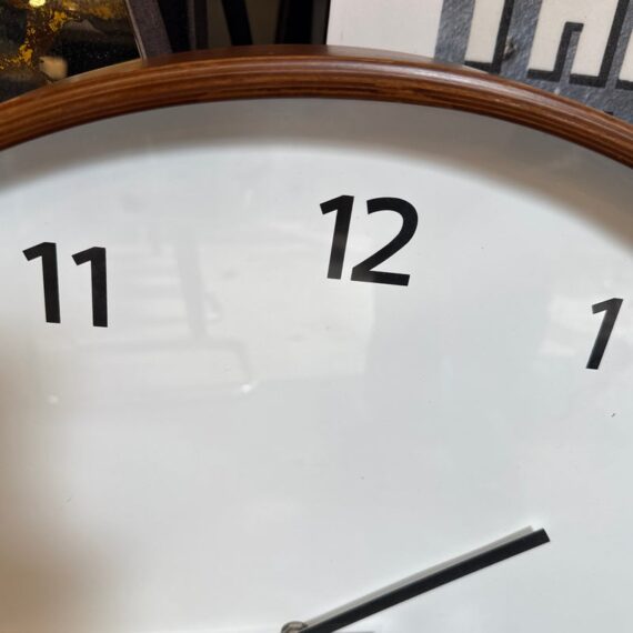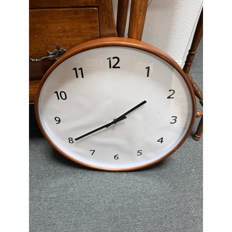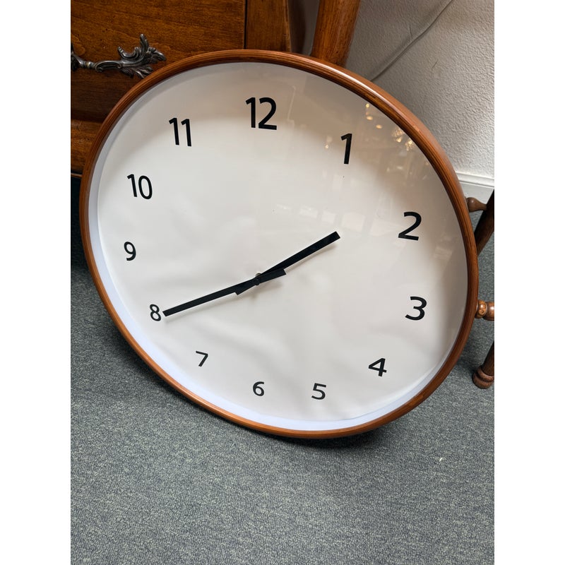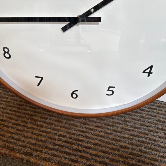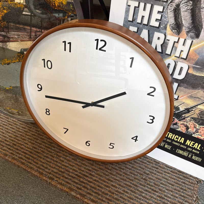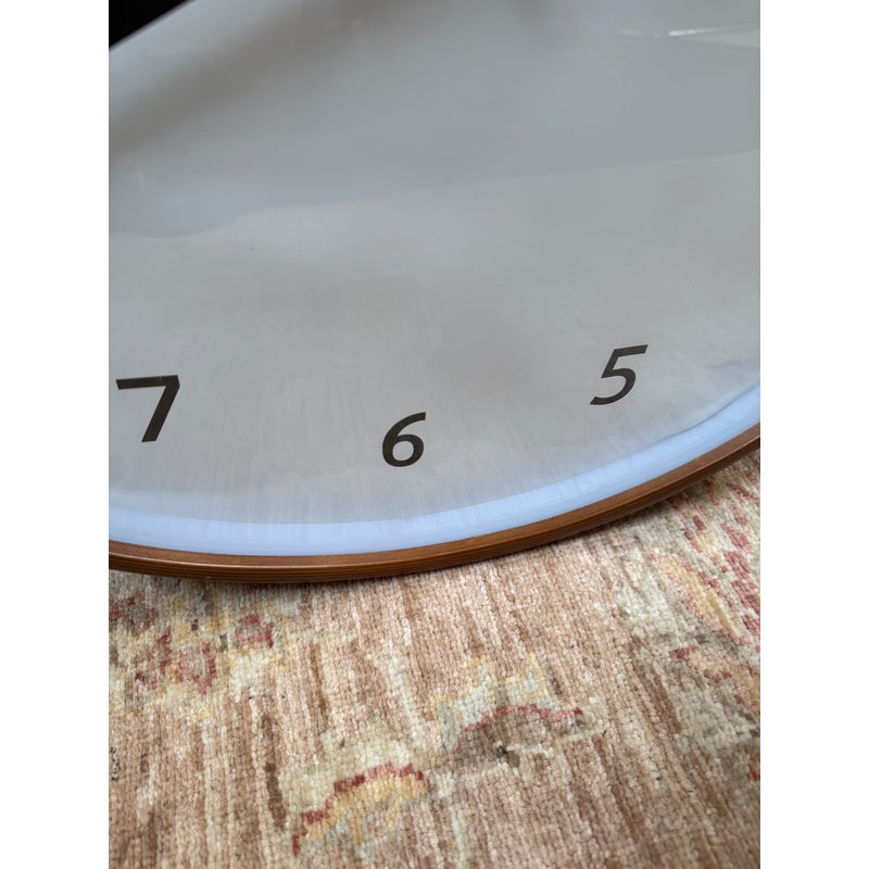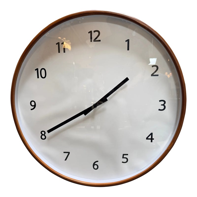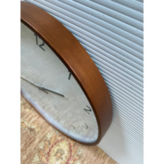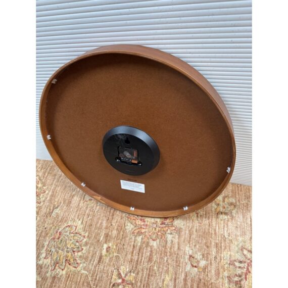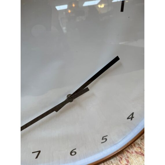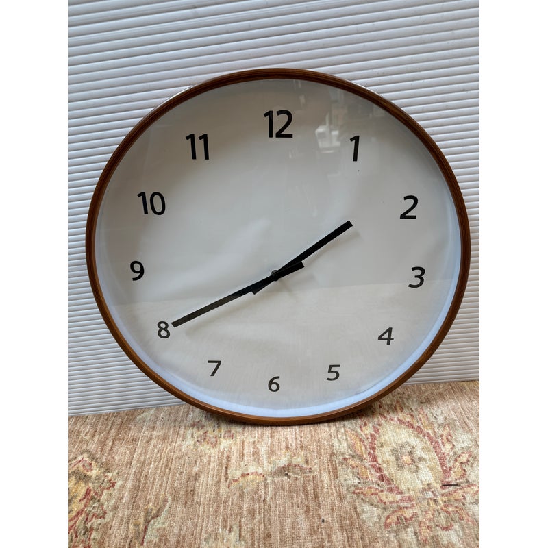 Design Plus Gallery presents the Modern Wall Clock from Crate & Barrel. Simplicity with a round clock face displaying simple numerals encased in walnut rimmed frame. Light surface wear; face is wrinkled; condition is fair for age and use.