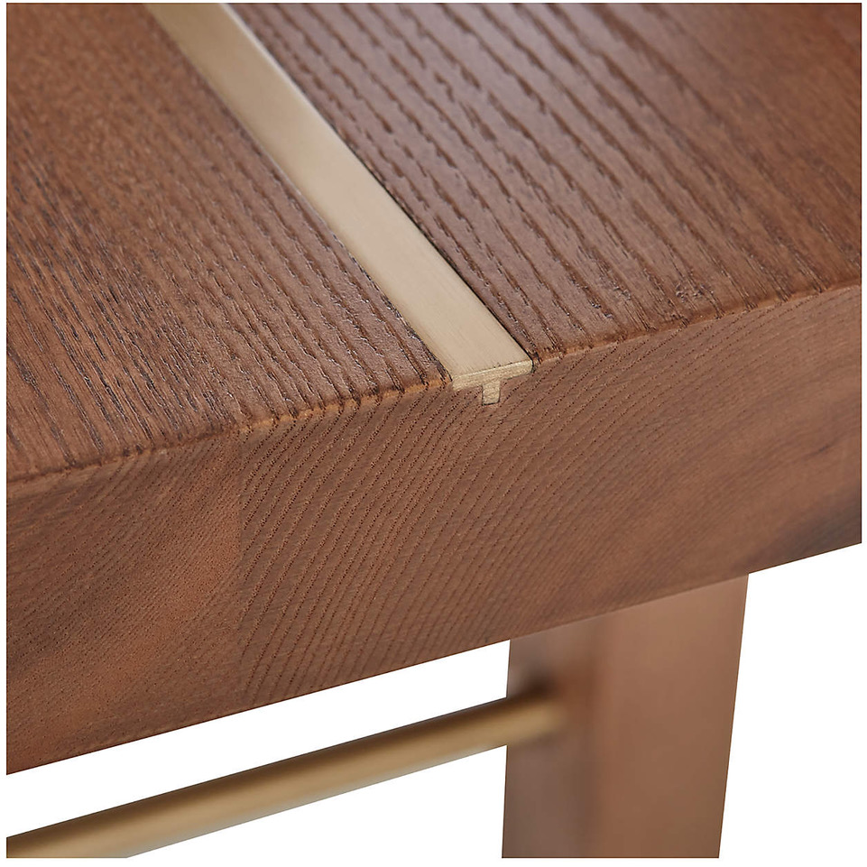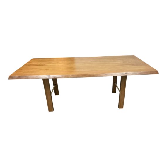 Design Plus Gallery presents a Montana Dining Table by Crate & Barrel. Flat-sawn to reveal a continuous flow of dome-shaped cathedral graining, a single length of sustainably sourced American ash forms the top of this majestic Montana dining table. Exhibiting live edges and the organic beauty of natural wood, the table mixes in a bit of metal with a brass-finished strip inlaid down the middle. Stretcher bars, also in brass, bolster sturdy square legs. The expertly crafted table is finished with tung tree oil for a lustrous layer of protection. A Solid FSC-certified American white ash with tung tree oil finish. Stainless steel band inlay with brass finish.