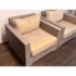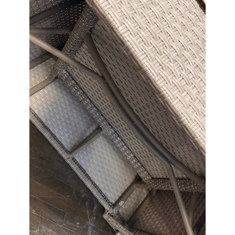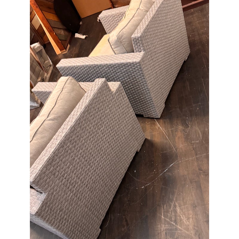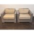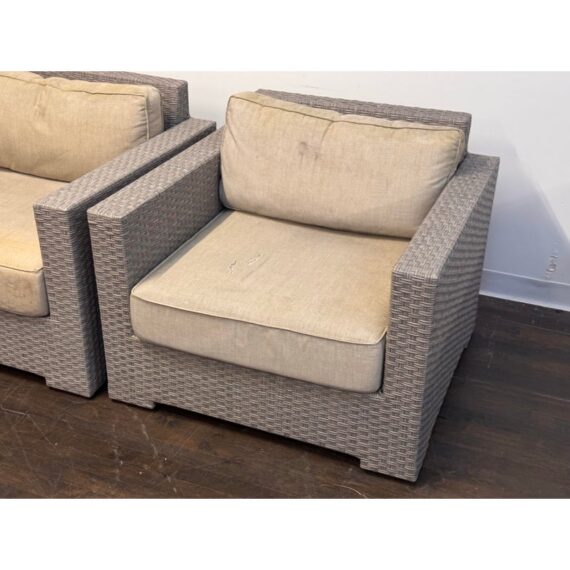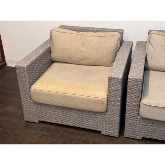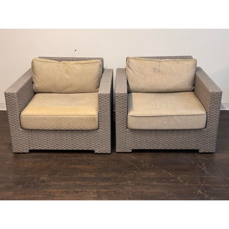 Design Plus Gallery presents a Pair of Outdoor Lounge Arm Chairs from Crate & Barrel. The chairs are designed with a bold block silhouette and a tightly woven exterior for a clean, tailored look. The structured frame offers a modern profile while the textured weave adds dimension and visual interest. Each chair includes loose seat and back cushions that provide a relaxed contrast to the geometric shape. The cushions are removable and would benefit from new upholstery or replacement cushions for a refreshed presentation. These are discontinued models with the brand and are in fair condition with visible tears on the cushions and minimal wear from usage.