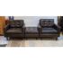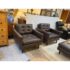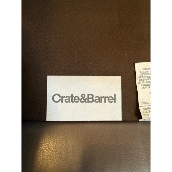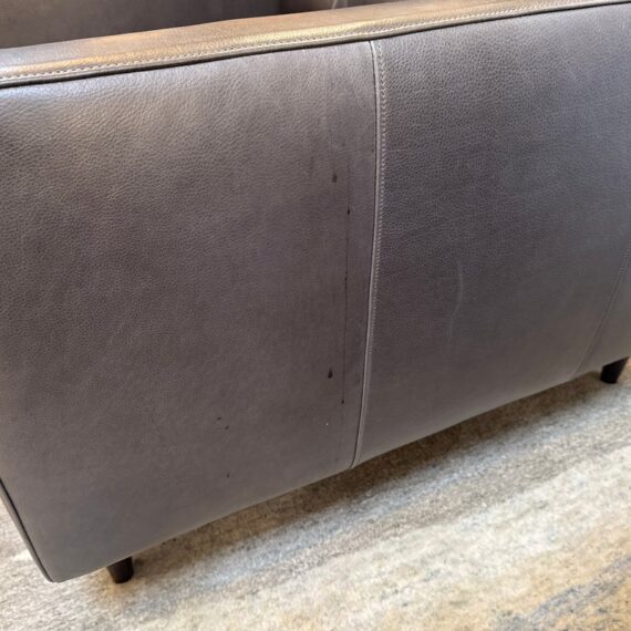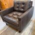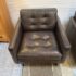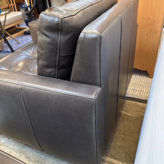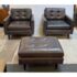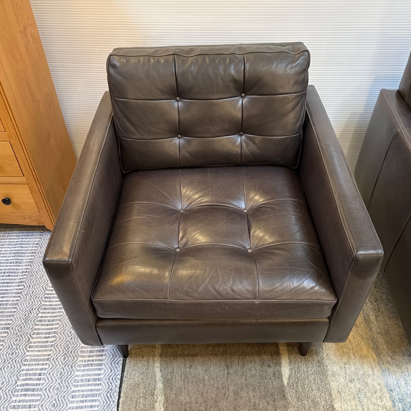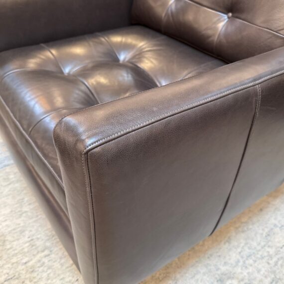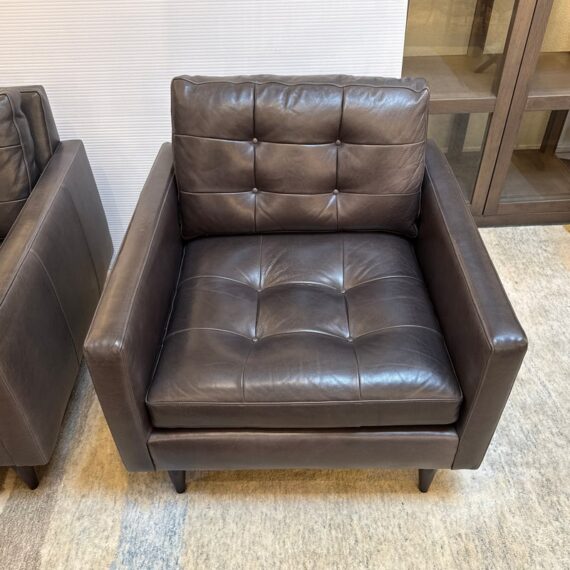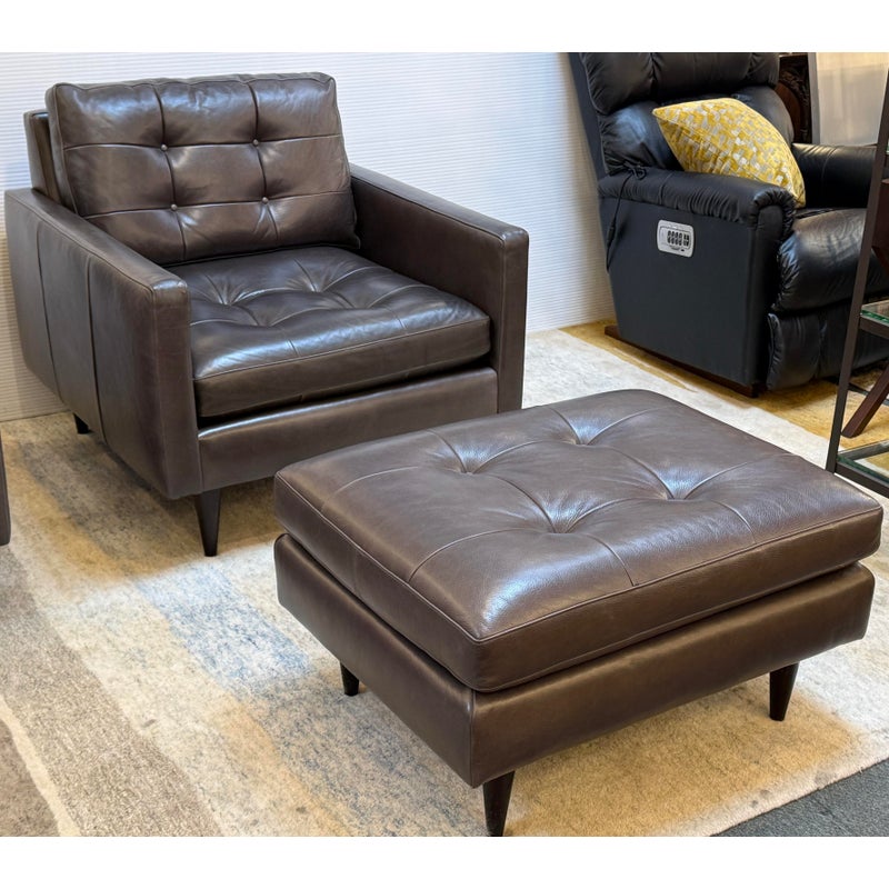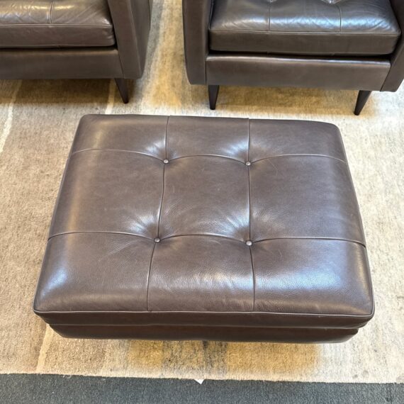 Design Plus Gallery presents a Pair of Petrie Leather Chairs and Coordinating Ottoman. The pair of lounge chairs with matching ottoman brings clean lines, tailored comfort, and full grain brown leather to your living space. They adapt to living environments with ease, versatility, and comfort as the chairs let you sit upright with support or lean back and unwind. Sleek, boxy cushions, slim track arms, and hand-tufted button detailing create a refined silhouette. In good condition, visible and minimal wear from usage. Made in USA.