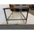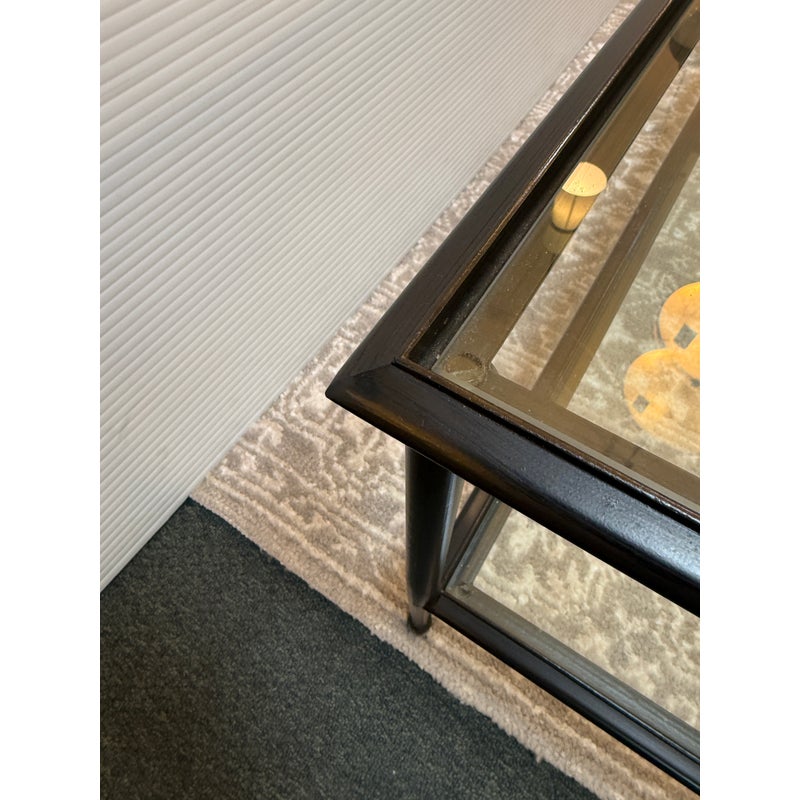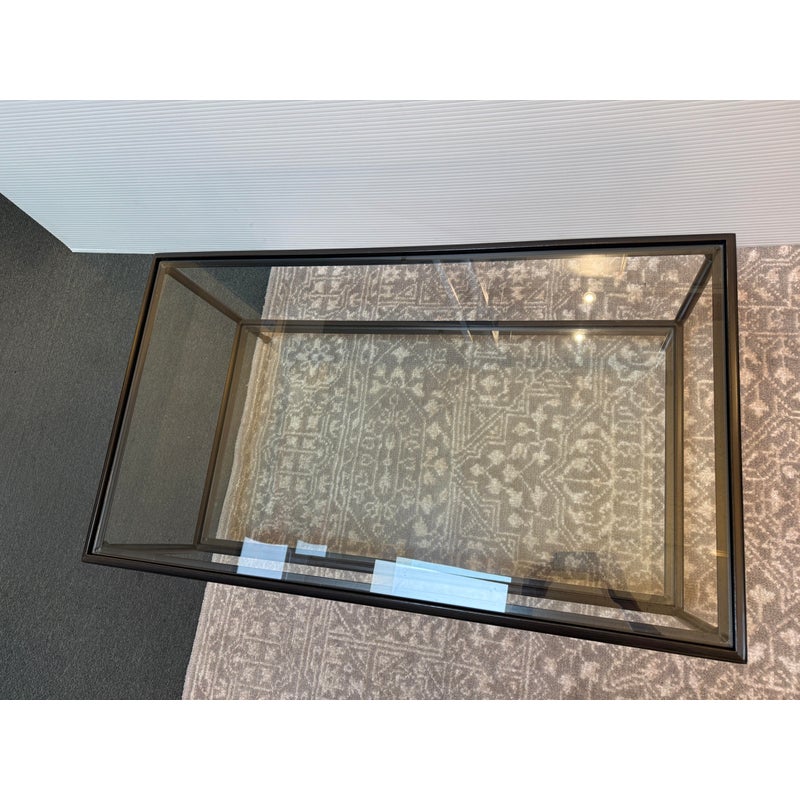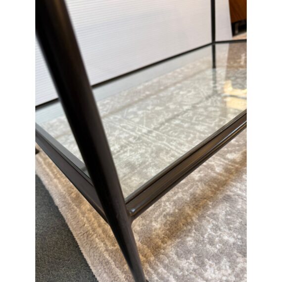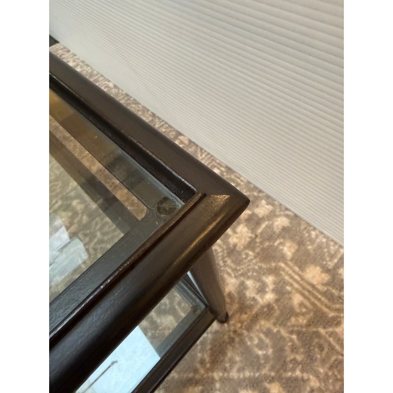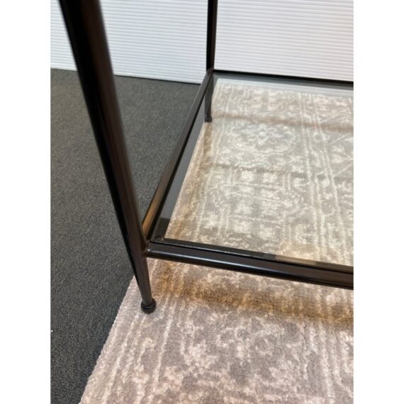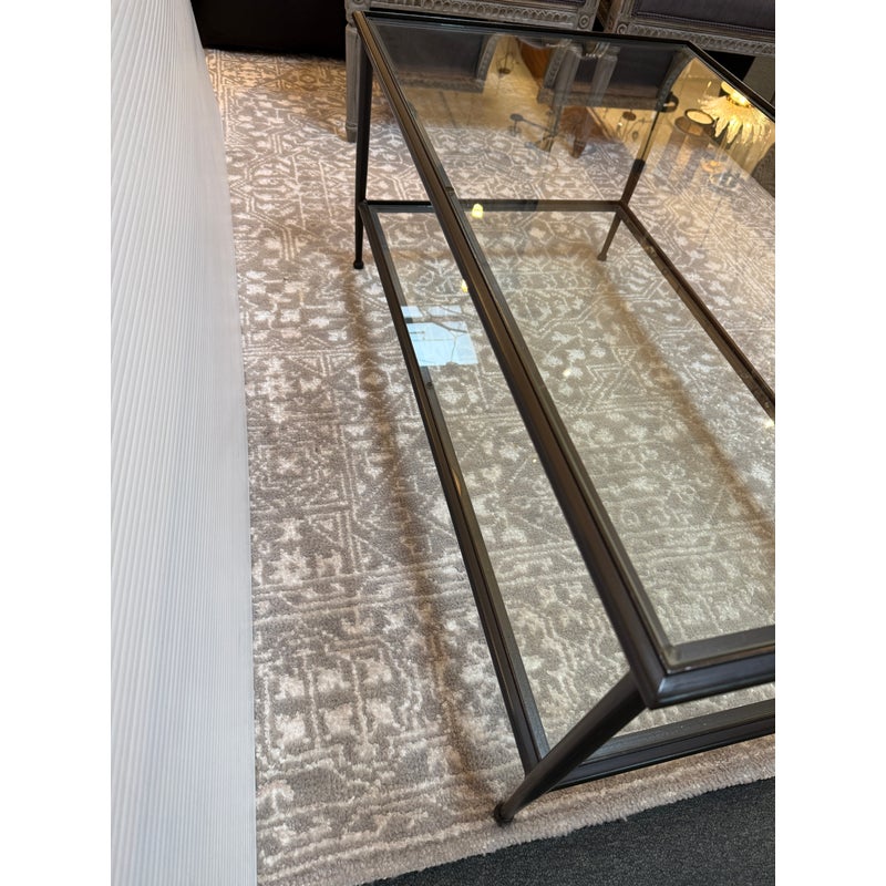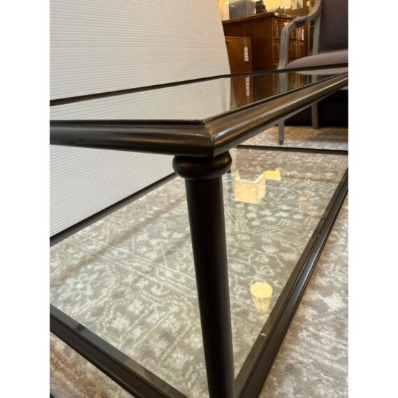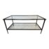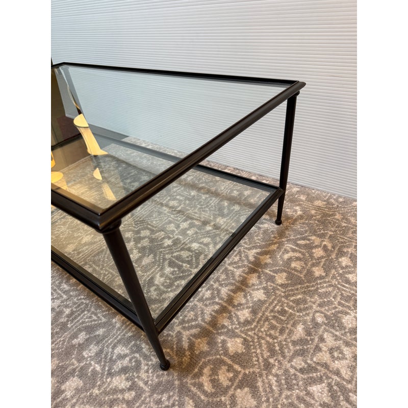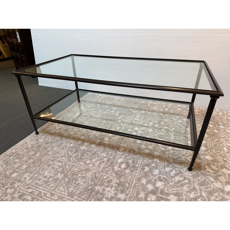 Design Plus Gallery presents a Pia Coffee Table from Crate & Barrel. The frame is constructed with metal in a dark finish and includes a glass top and glass lower shelf. The metal borders feature subtle concave curves. The legs are round with a taper near the feet. This is a discontinued model with the brand. In good condition, visible and minimal wear from usage.