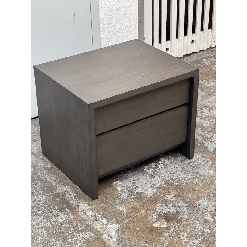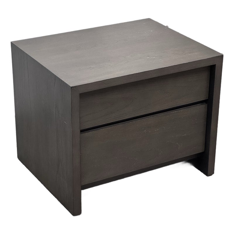 Design Plus Gallery presents the Reed Nightstand by Blake Tovin for Crate & Barrel. The bed side table has a an American dark oak stain over poplar and hardwood veneers. Clean, modern nightstand gives you a set of two generously sized drawers that also offer full expansion. This style is no longer in production with the brand and is in good condition for its use with wear that is consistent with age.