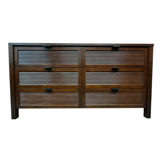 Design Plus Gallery presents a Six Drawer Ribbed Panel Dresser by Room & Board. A clean silhouette that is echoed in the lines of the inset panels on each of the six drawers. Lightly elevated and finished in a warm hue that allows the woodgrain to show through, the storage is finished with bronze finger pulls. Surface wear visible; condition consistent with age and use.