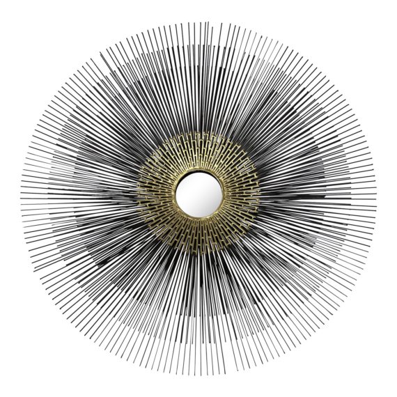 Design Plus Gallery presents a Starburst Mirror by Crate & Barrel. Is inspired by a mid-century antique. A mini mirror is surrounded by an antiqued brass geometric starburst radiating three layers of steel spring wires. Brass drippings create a bright textural circle at the center. Tips and advice on adding mirrors to your home decor. Steel spring wire with brass drippings. Visible and minor wear from usage.