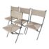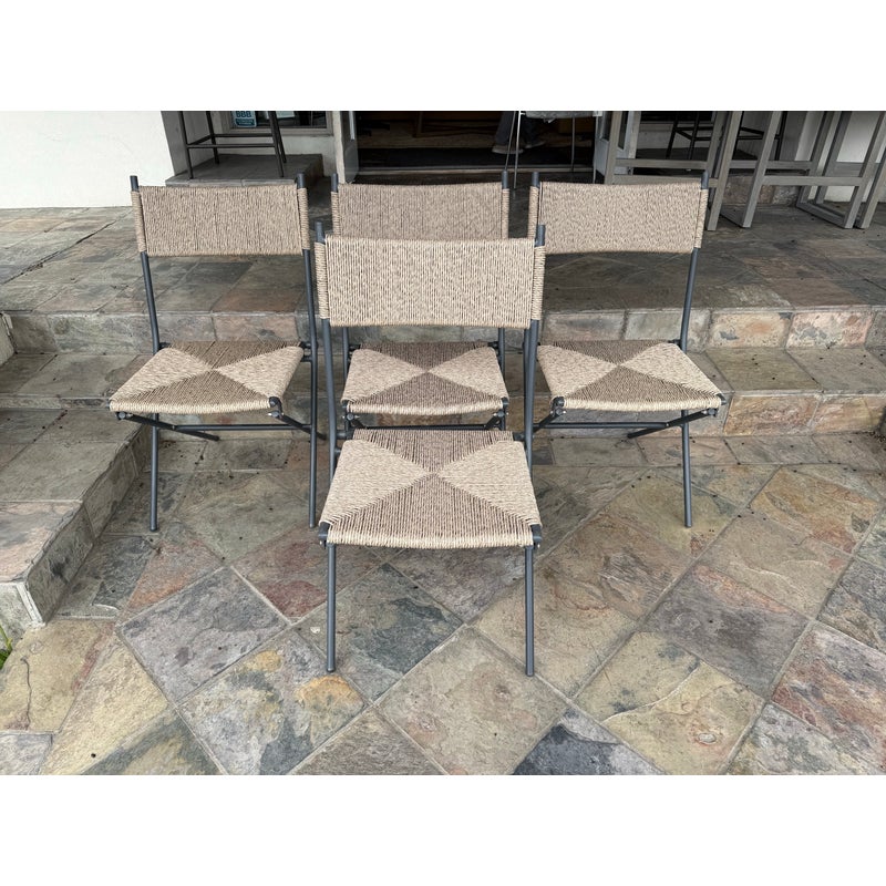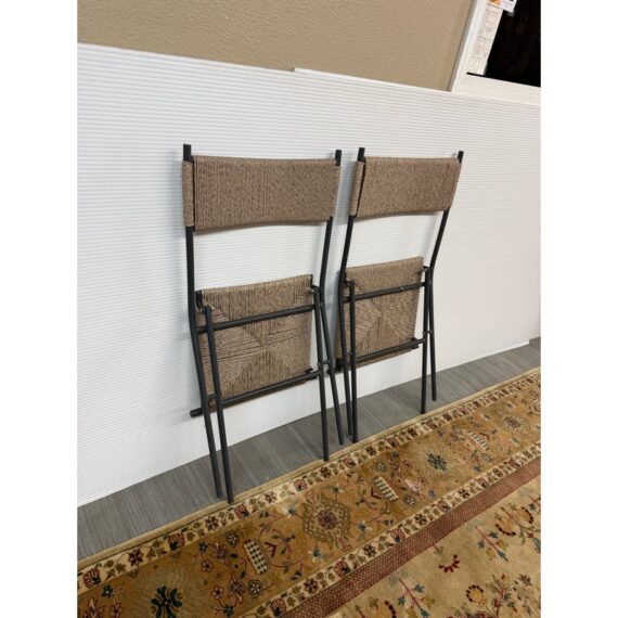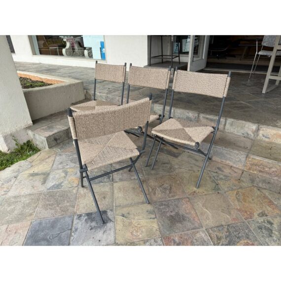 Design Plus Gallery presents a Set of Four San Onofre Chairs from Crate & Barrel. These chairs take a stylish approach to the everyday folding chair. All-weather resin nearly wraps the back panel and seat with the variegated color and texture of real wicker. The black-coated tubular frame streamlines the minimalist charm of classic metal bistro chairs, folding slim for convenient storage. They are both in good condition with minimal visible wear for their usage.