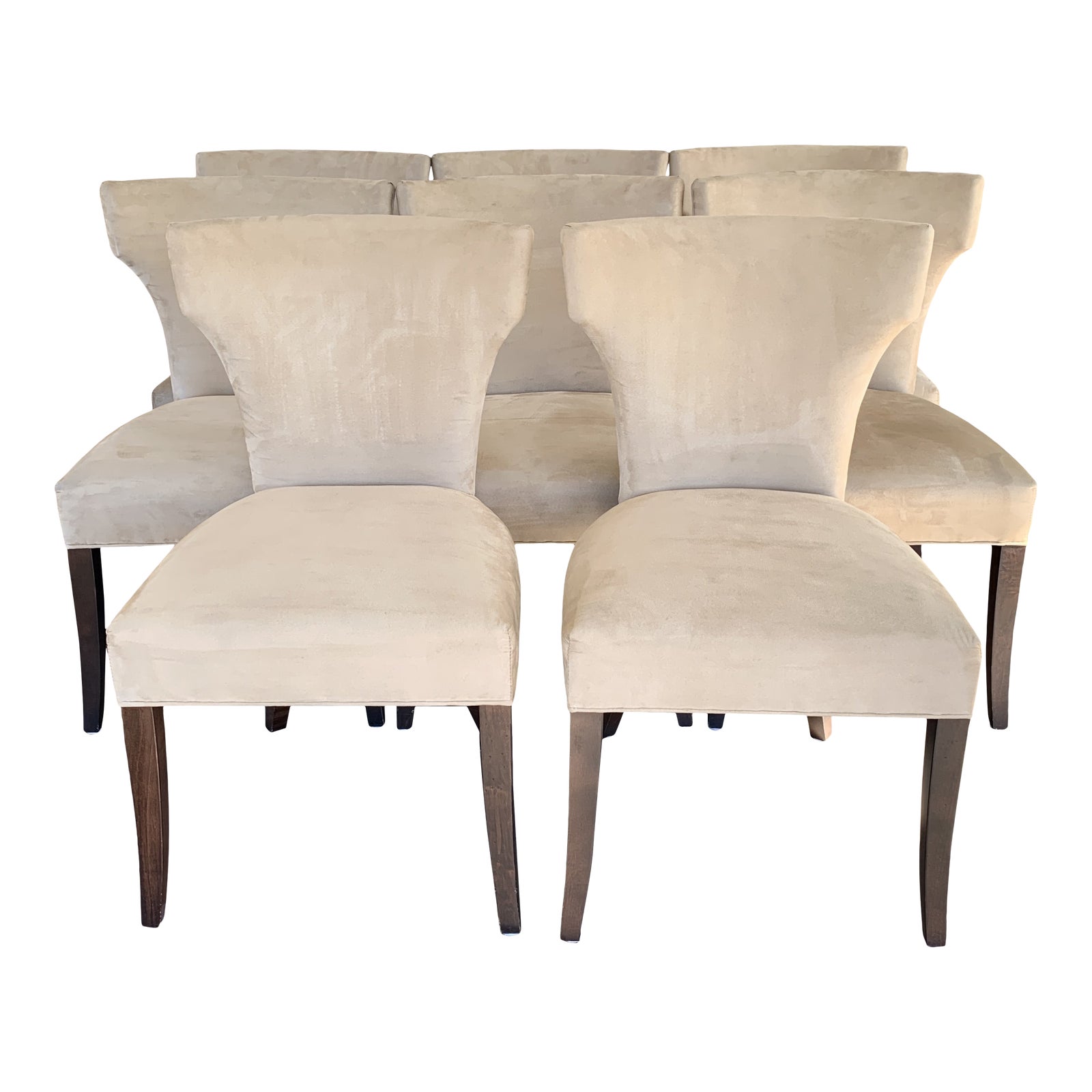 Design Plus Gallery presents a set of Sasha Dining Chairs by Crate & Barrel. This set of eight dining chairs are solid comfort crafted from a sustainable hardwood frame, webbing suspension for durability and plant based polyfoam for comfort. The striking silhouette has a cinched back upholstered in creamy suede, and tapered espresso finished legs. Made in the USA. Seat Height: 20 inches.