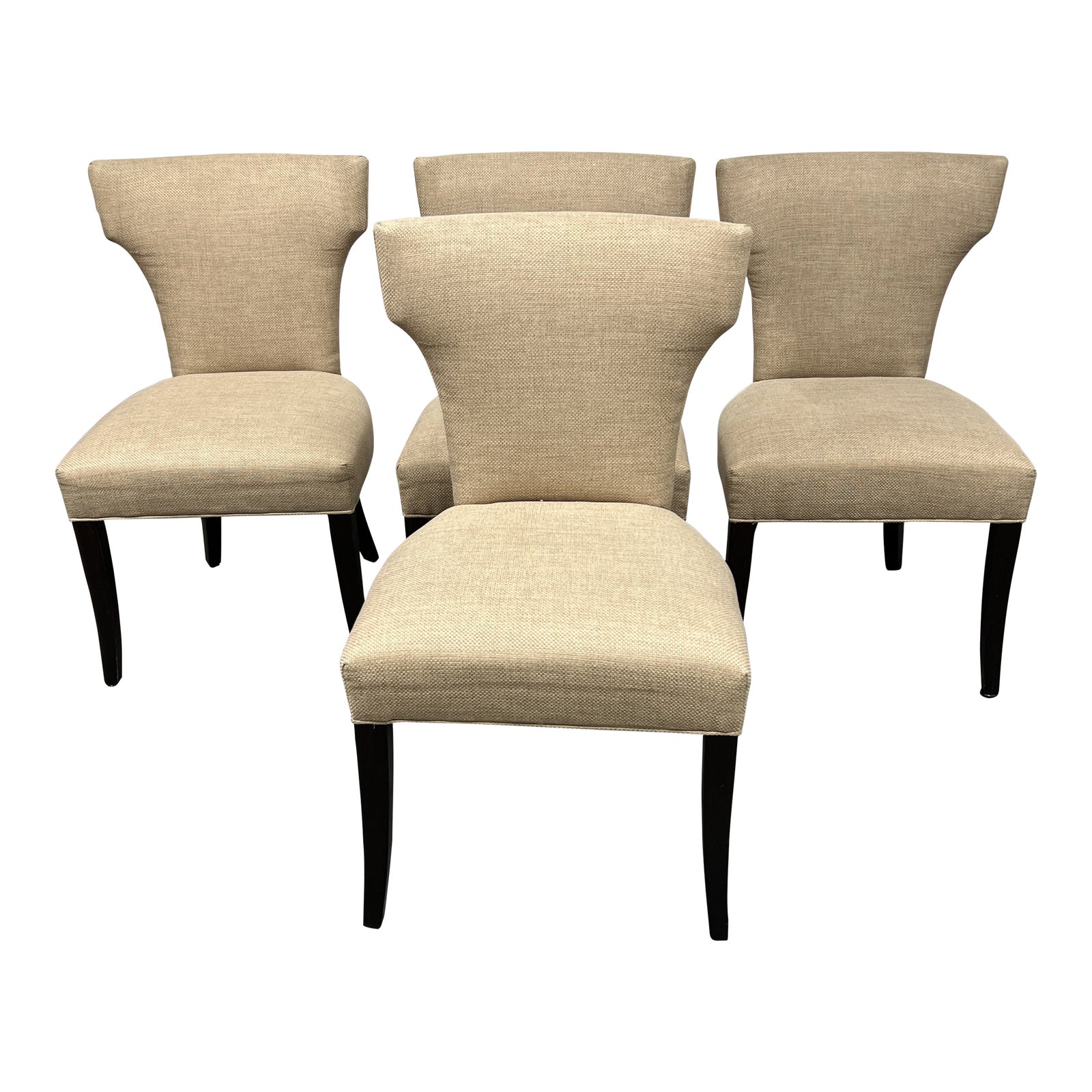 Design Plus Gallery presents a Set of Four Sasha Upholstered Dining Side Chairs by Crate & Barrel. A classic glamour upholstered dining chair that cuts a striking silhouette. An elegant, cinched padded back and plush tight seat offer table side comfort and style, smartly tailored in an easy-care weave with a self-welt to trace all its curves. Classic modern hardwood legs are stained a dark finish. A Crate and Barrel exclusive. Minor wear from usage.